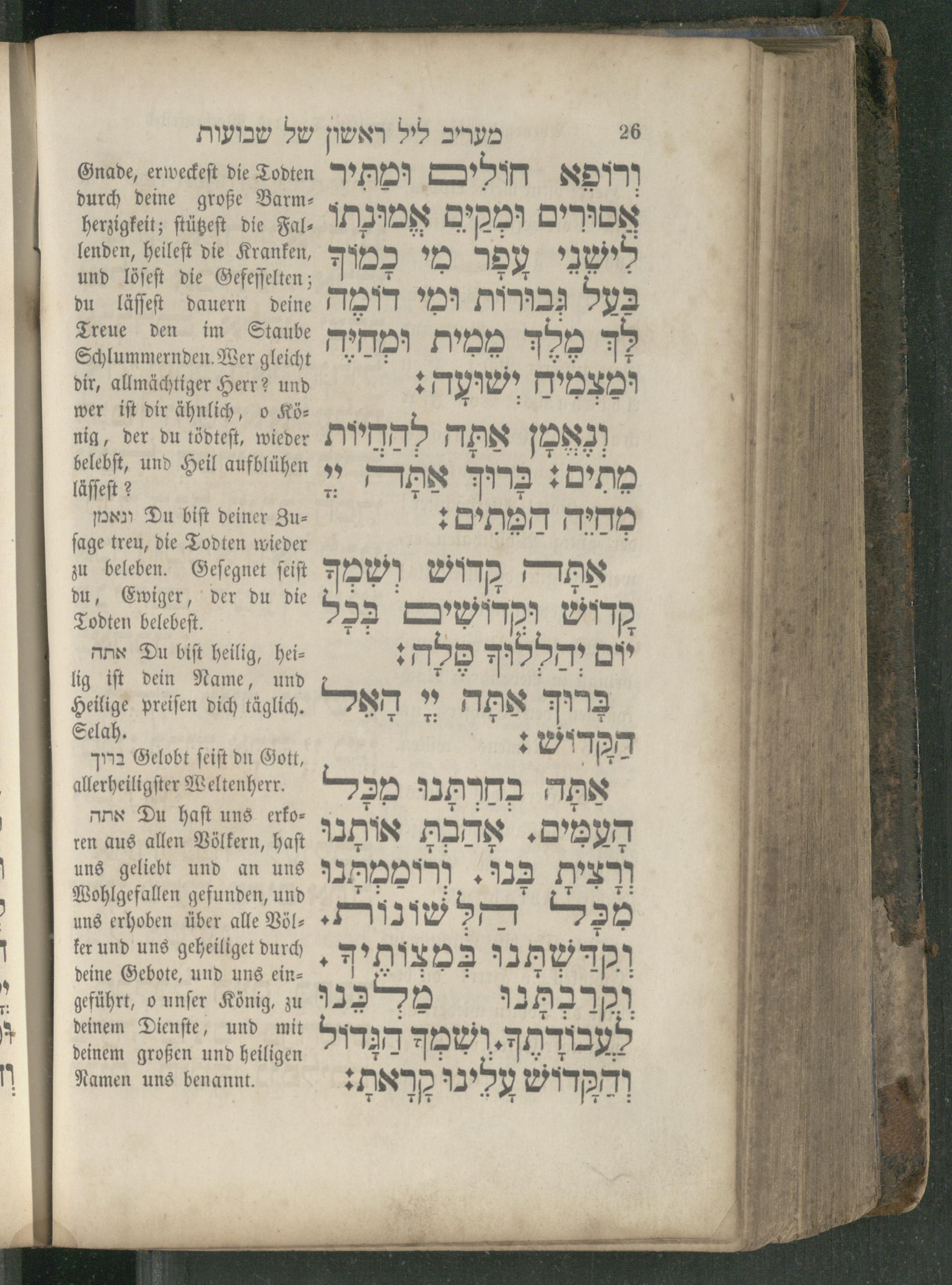Du haſt uns erko⸗ אתה ren aus allen Völkern, haſt uns geliebt und an uns Wohlgefallen gefunden, und uns erhoben über alle Völ⸗ ker und uns geheiliget durch deine Gebote, und uns ein⸗ geführt, o unſer König, zu deinem Dienſte, und mit deinem großen und heiligen Namen uns benannt.