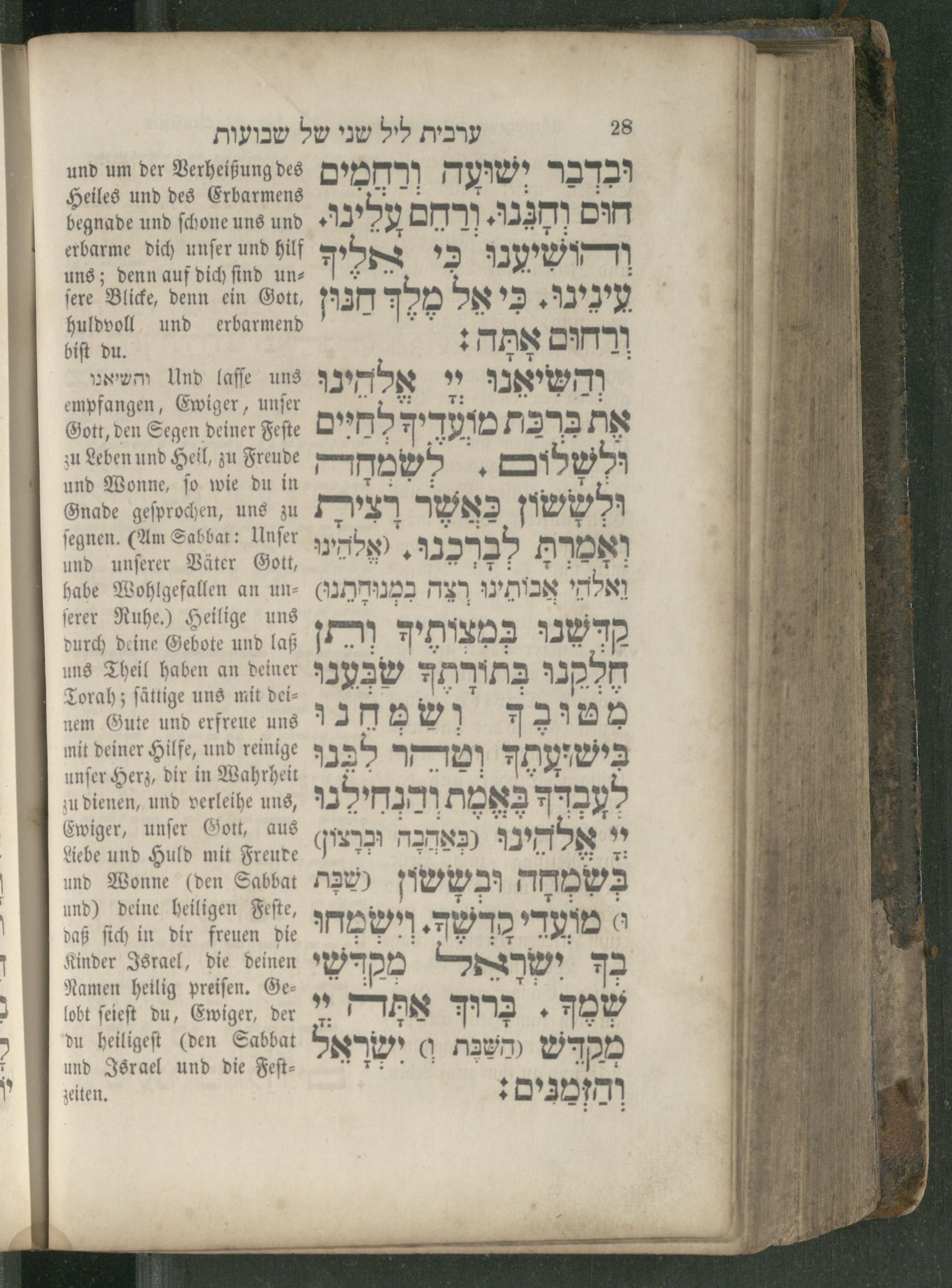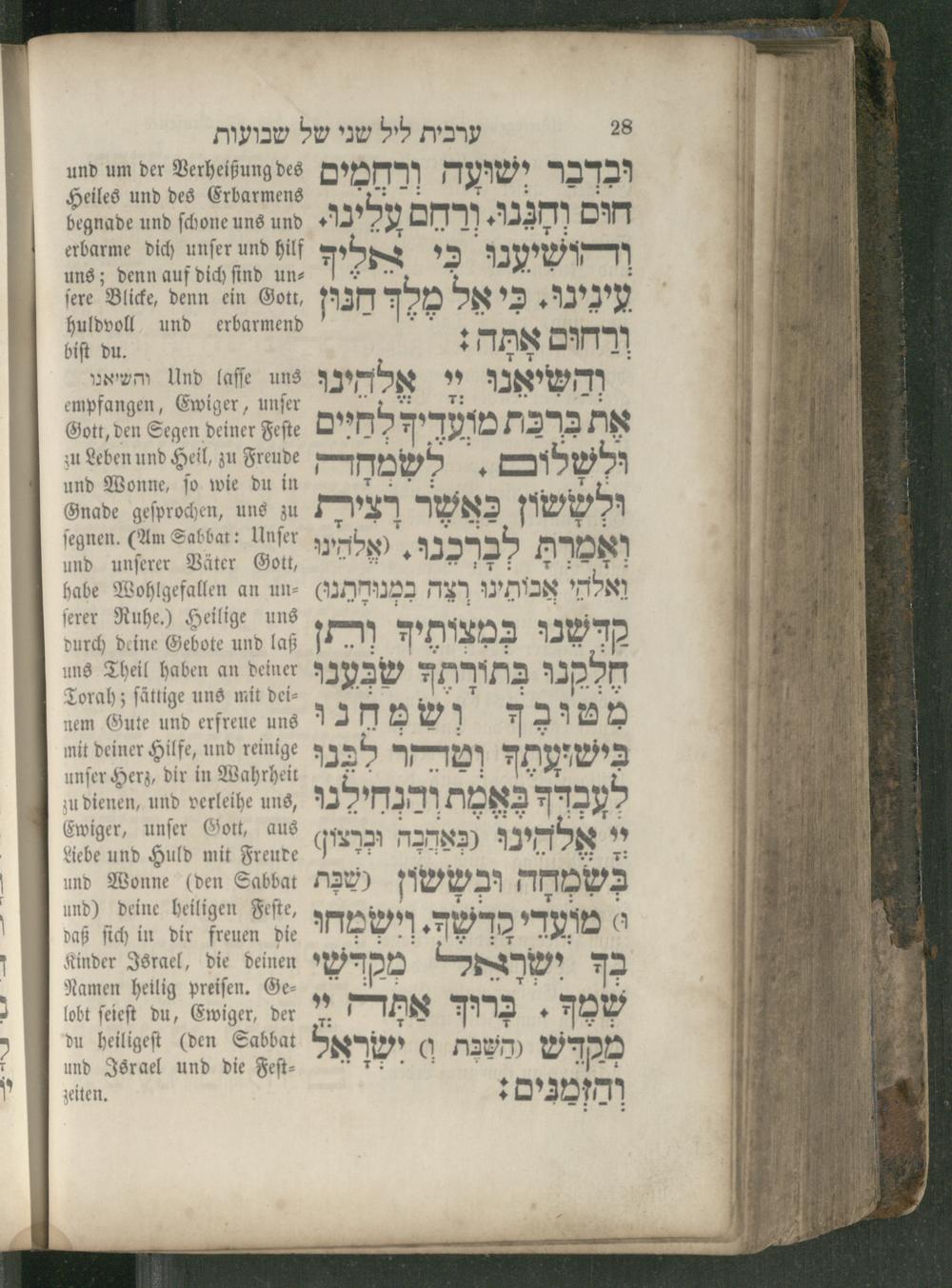 Und laſſe uns והשיאנו empfangen, Ewiger, unſer Gott, den Segen deiner Feſte zu Leben und Heil, zu Freude und Wonne, ſo wie du in Gnade geſprochen, uns zu ſegnen.(Am Sabbat: Unſer und unſerer Väter Gott, habe Wohlgefallen an un⸗ ſerer Ruhe.) Heilige uns durch deine Gebote und laß uns Theil haben an deiner Torah; ſättige uns mit dei⸗ nem Gute und erfreue uns mit deiner Hilfe, und reinige unſer Herz, dir in Wahrheit zu dienen, und verleihe uns, Ewiger, unſer Gott, aus Liebe und Huld mit Freude und Wonne(den Sabbat und) deine heiligen Feſte, daß ſich in dir freuen die Kinder Israel, die deinen Namen heilig preiſen. Ge⸗ lobt ſeieſt du, Ewiger, der du heiligeſt(den Sabbat und Israel und die Feſt⸗ zeiten.