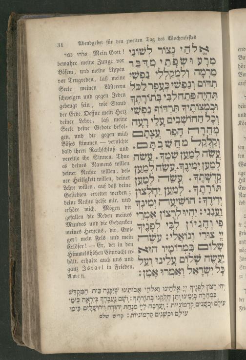 ner Heiligkeit willen, deiner Lehre willen, auf daß deine Geliebten errettet werden; deine Rechte helfe mir, und erhöre mich. Mögen dir gefallen die Reden meines Mundes und die Gedanken meines Herzens, dir, Ewiger! mein Fels und mein Erlöſer!— Er, der in den Himmelshöhen Eintracht erhält, erhalte auch uns und ganz Israel in Frieden. Amen.