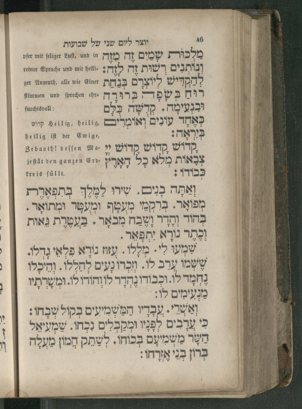 מלְכוּרת שָמים זה, mit ſelget Suft, und in אע וניתנים רשות זה*: reiner Sprache und mit heili⸗ להקדיש ger Anmuth, alle wie Einer rig Day רוב hp בּרוּרָה ſtimmen und ſprechen ehr⸗