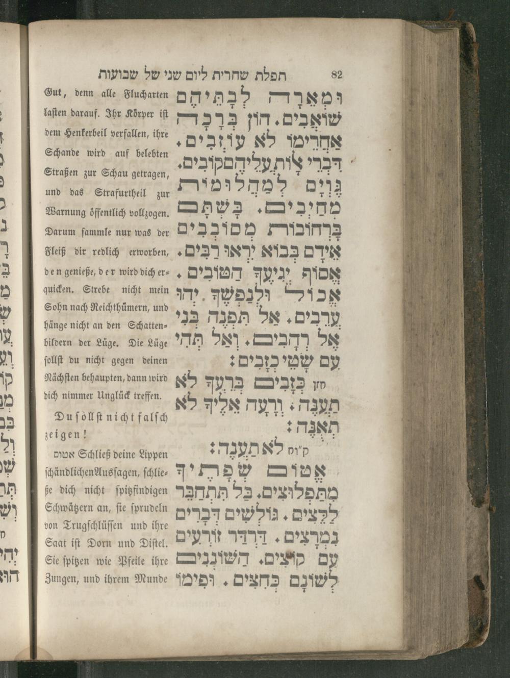 82 חפלת שחרית ליום שני של שבועות ומאר. בת יחה יפוק out, ram ale DENT. חון 3 2= laſten darauf. Ihr Körper iſt אחרימו ו לא ע. זב ים. dem Henkerbeil verfallen, ihre v xx , עליהבקובים. Schande wird auf belebten d 3 יל מ 7: ומירת und das Strafurtheil zur m 5 27; ב=. Warnung oͤffentlich vollzogen. m A dJ בּרְחובורת מ 8 35 בים Darum ſammle nur was der אידם 8153 8 Fleiß dir redlich erworben, az“ אסוף יגיעד המובים, den genieße, der wird dich r אכוי- ולנפשד יחו quicken. Strebe nicht mein ערבים. אל Sohn nach Reichthümern, und 22 dn