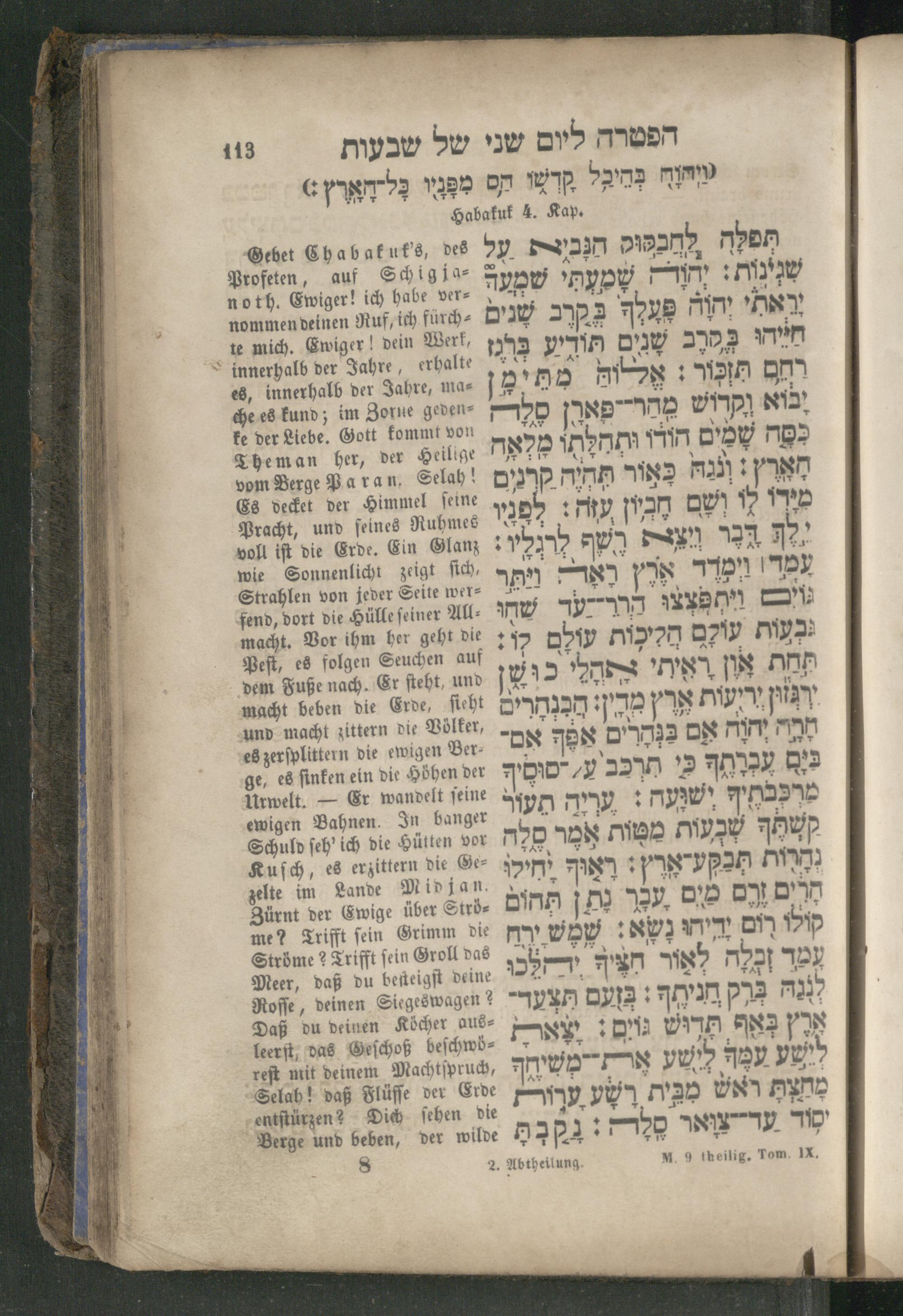 Gebet Chabakuk's, des Profeten, auf Schi g j anoth. Cwiger! ich habe vernommen deinen Ruf, ich fürchte mich. Ewiger! dein Werk, innerhalb der Jahre, erhalte