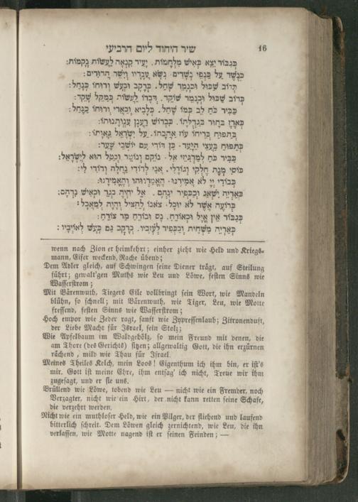 Wie Apfelbaum im Waldgehölz, ſo mein Freund mit denen, die am Thore(des Gerichts) figen; allgewaltig Gott, die ihn erzürnen rächend, mild wie Thau für Iſrael.