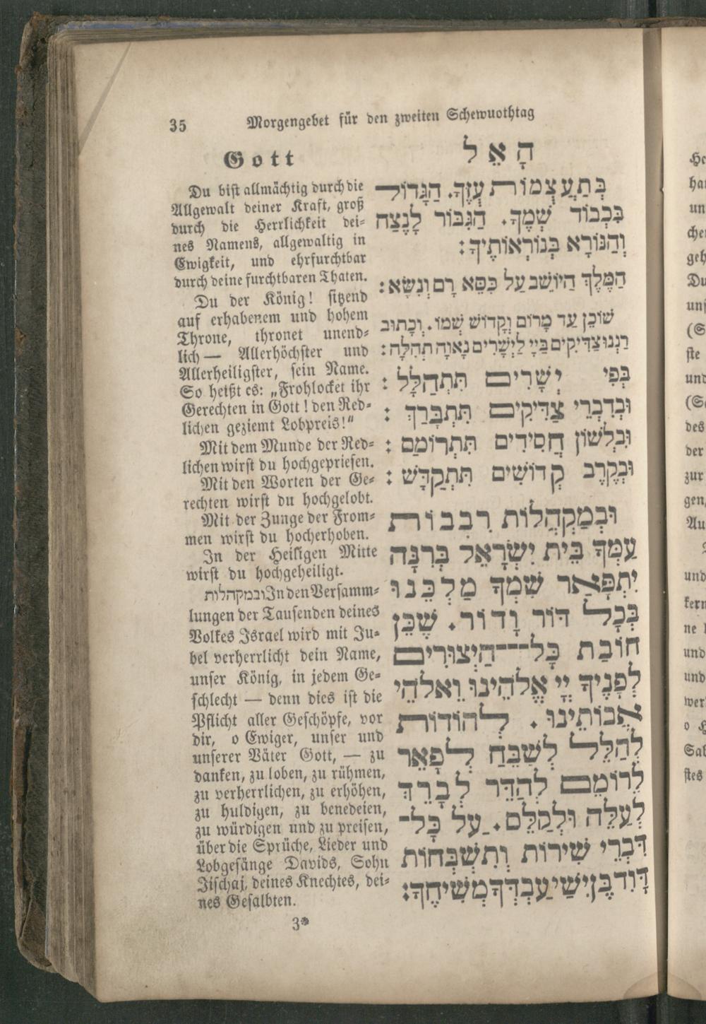 lungen der Tauſenden deines Volkes Israel wird mit Jubel verherrlicht dein Name, unſer König, in jedem Geſchlecht— denn dies iſt die Pflicht aller Geſchöpfe, vor dir, o Ewiger, unſer und unſerer Väter Gott,— zu danken, zu loben, zu rühmen, zu verherrlichen, zu erhöhen, zu huldigen, zu benedeien, zu würdigen und zu preiſen, über die Sprüche, Lieder und