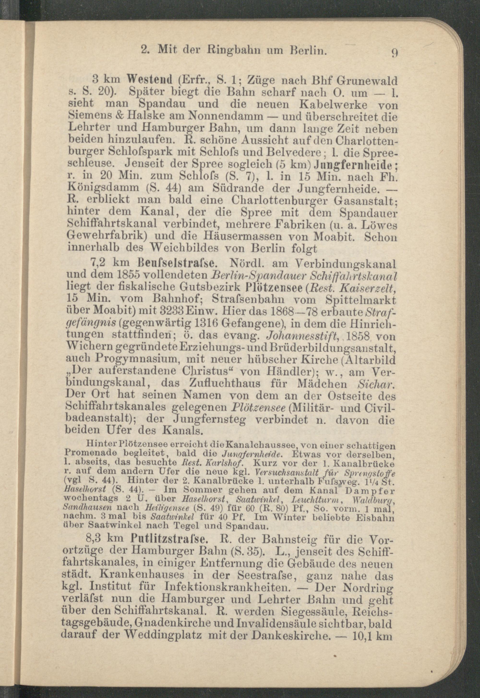 8.3 km Putlitzstraße. R. der Bahnsteig für die Vorortzüge der Hamburger Bahn (S. 35). L., jenseit des Schifffahrtskanales, in einiger Entfernung die Gebäude des neuen städt. Krankenhauses in der Seestraße, ganz nahe das kgl. Institut für Infektionskrankheiten. — Der Nordring verläßt nun die Hamburger und Lehrter Bahn und geht über den Schiffahrtskanal. R. werden Siegessäule, Reichstagsgebäude, Gnadenkirche und Invalidensäule sichtbar, bald darauf der Weddingplatz mit der Dankeskirche.— 10,1 km