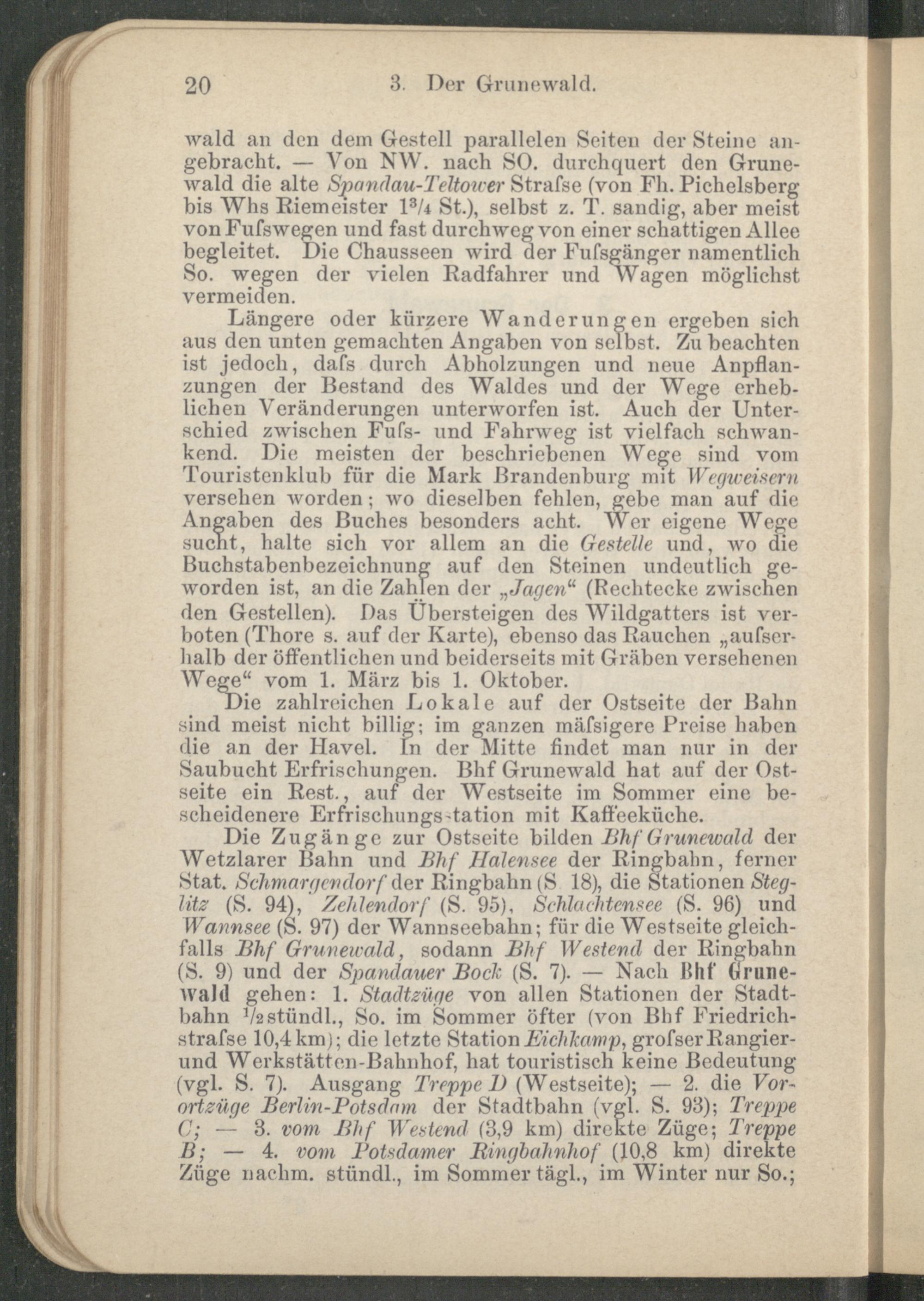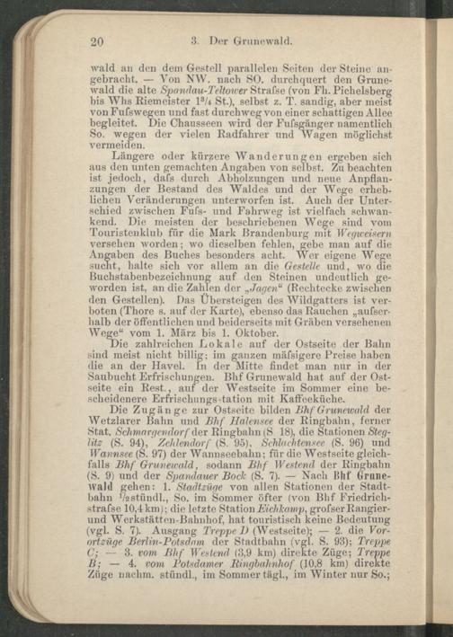 Die Zugänge zur Ostseite bilden Bhf Grunewald der Wetzlarer Bahn und Bhf Halensee der Ringbahn, ferner Stat. Schmargendorf der Ringbahn (S 18), die Stationen S teglitz (S. 94), Zehlendorf (S. 95), Schlachtensee (S. 96) und Wannsee (S. 97) der Wannseebahn; für die Westseite gleichfalls Bhf Grunewald , sodann Bhf Westend der Ringbahn (S. 9) und der Spandauer Bock (S. 7). — Nach Bhlf Grune- wald gehen: l. Stadtzüge von allen Stationen der Stadtbahn 1/2stündl., So. im Sommer öfter (von Bhf Friedrich- straße 10,4 km); die letzte Station Eichkamp, großer Rangier- und Werkstätten-Bahnhof, hat touristisch keine Bedeutung (vgl. S. 7). Ausgang Treppe I) (Westseite); — 2. die Vorortzüge Berlin-Potsdam der Stadtbahn (vgl. S. 93); Treppe C; — 3. vom Bhf Westend (3,9 km) direkte Züge; Treppe B; — 4. vom Potsdamer Ringbahnhof (10,8 km) direkte Züge nachm. stündl., im Sommer tägl., im Winter nur So.;