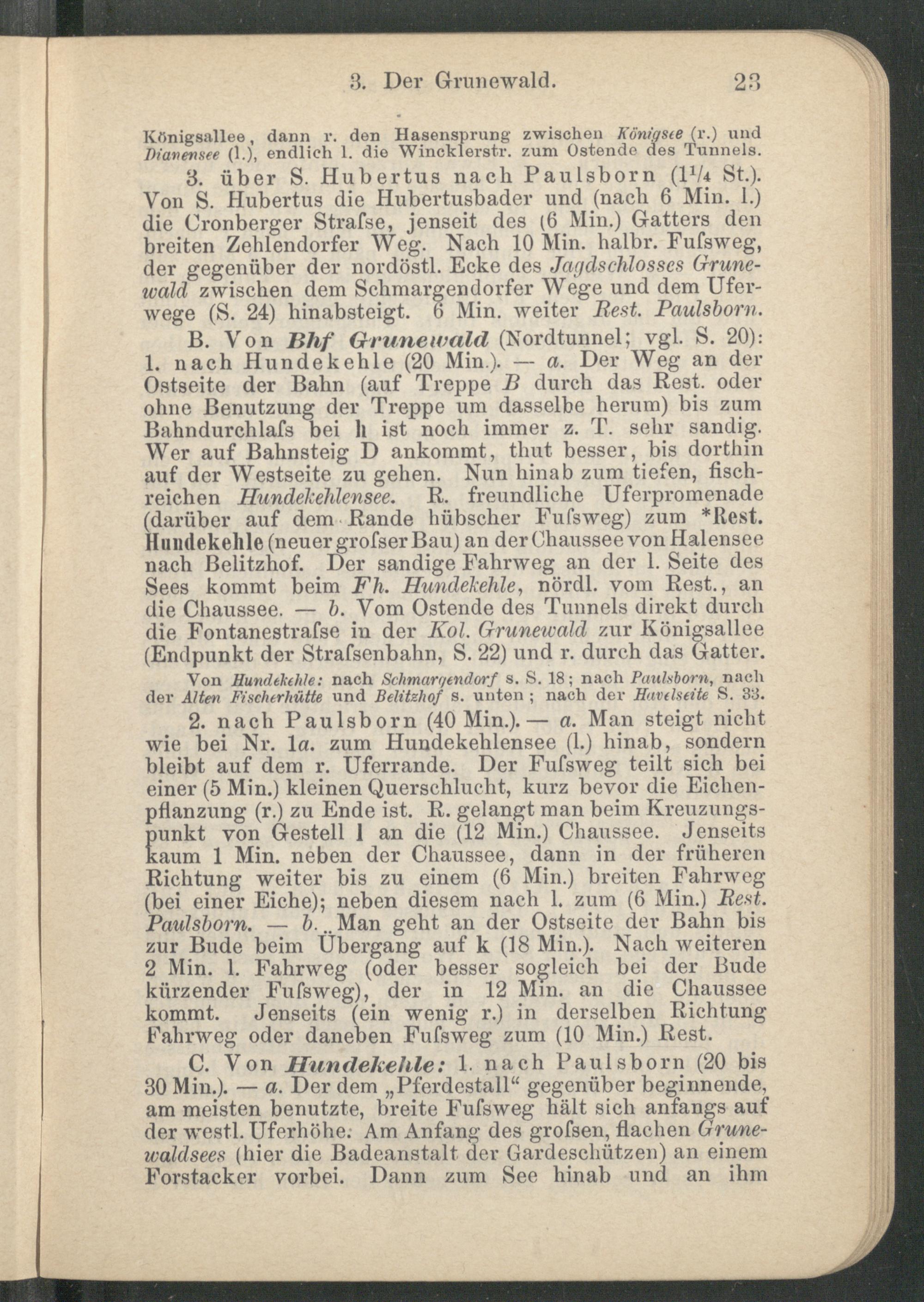 B. Von Bhf Grunewald ( Nordtunnel; vgl. S. 20): 1. nach Hundekehle (20 Min). — a. Der Weg an der Ostseite der Bahn (auf Treppe B durch das Rest, oder ohne Benutzung der Treppe um dasselbe herum) bis zum Bahndurchlass bei h ist noch immer z. T. sehr sandig. Wer auf Bahnsteig D ankommt, thut besser, bis dorthin auf der Westseite zu gehen. Nun hinab zum tiefen, fischreichen Hundekehlensee. R. freundliche Uferpromenade (darüber auf dem Rande hübscher Fußweg) zum *Rest. Hundekehle (neuer großer Bau) an der Chaussee von Halensee nach Belitzhof. Der sandige Fahrweg an der 1. Seite des Sees kommt beim Fh. Hundekehle, nördl. vom Rest., an die Chaussee. — b. Vom Ostende des Tunnels direkt durch die Fontanestraße in der K ol. Grunewald zur Königsallee (Endpunkt der Straßenbahn, S. 22) und r. durch das Gatter.