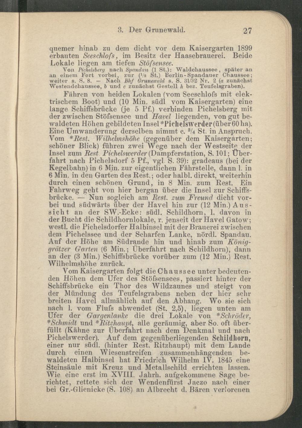 Vom Kaisergarten folgt die Chaussee unter bedeutenden Höhen dem Ufer des Stößensees, passiert hinter der Schiffsbrücke ein Thor des Wildzaunes und steigt von der Mündung des Teufelsgrabens neben der hier sehr breiten Havel allmählich auf den Abhang. Wo sie sich nach 1. vom Fluß abwendet (St. 2,5), liegen unten am Ufer der Gargenlanke die drei Lokale von *Schröder, * Schmidt und *Ritzhaupt, alle geräumig, aber So. oft überfüllt (Kähne zur Überfahrt nach dem Denkmal und nach Pichelswerder). Auf dem gegenüberliegenden Schildhorn, einer nur südl. (hinter Rest. Ritzhaupt) mit dem Lande durch einen Wiesenstreifen zusammenhängenden bewaldeten Halbinsel hat Friedrich Wilhelm IV. 1845 eine Steinsäule mit Kreuz und Metallschild errichten lassen. Wie eine erst im XVIII. Jahrh. aufgekommene Sage berichtet, rettete sich der Wendenfürst Jaczo nach einer bei Gr.-Glienicke (S. 108) an Albrecht d. Bären verlorenen