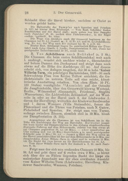 B. Von . Schildhor n nach Belitzhof (c. 2 St.) Die Chaussee, die beim ersten Schildhornlokal weit nach 1. ausbiegt, wendet sich nachher wieder r., überschreitet auf hohem Damme den Dachsgrund und steigt dann noch etwas auf die Höhe des Karlsberges (77 m). Auf diesem erhebt sich, von Anlagen umgehen, der 56 m hohe *Kaiser Wilhelm-Turm, ein prächtiger Backsteinbau, 1897—98 nach Schwechtens Plan vom Kreise Teltow errichtet; die Gedächtnishalle im unteren Teile soll eine reiche, künstlerische Ausstattung erhalten. Von oben (Eintr. 10 Pf.; 183 Stufen) vorzügliche **Aussicht: auf der Ostseite die Jungfernheide, über den Grunewald hinweg Westend, Berlin, Wilmersdorf (Gasanstalt), Friedenau, Steglitz (Wasserturm), Gr.-Lichterfelde, Zehlendorf; auf der Westseite in oder an der Havel nach S. der Lindwerder (1. davon der Havelberg), weiterhin der Kladower Sandwerder und 1. davon Wannsee (Villa Stolzenfels), ferner die Pfaueninsel und die Türme von Potsdam, nach N. Gatow, Pichelsdorf und Spandau. Sw. steigt man vom Turme, anfangs zwischen Zäunen, ziemlich steil in 10 Min. hinab zur Dampferstation (S. 101).