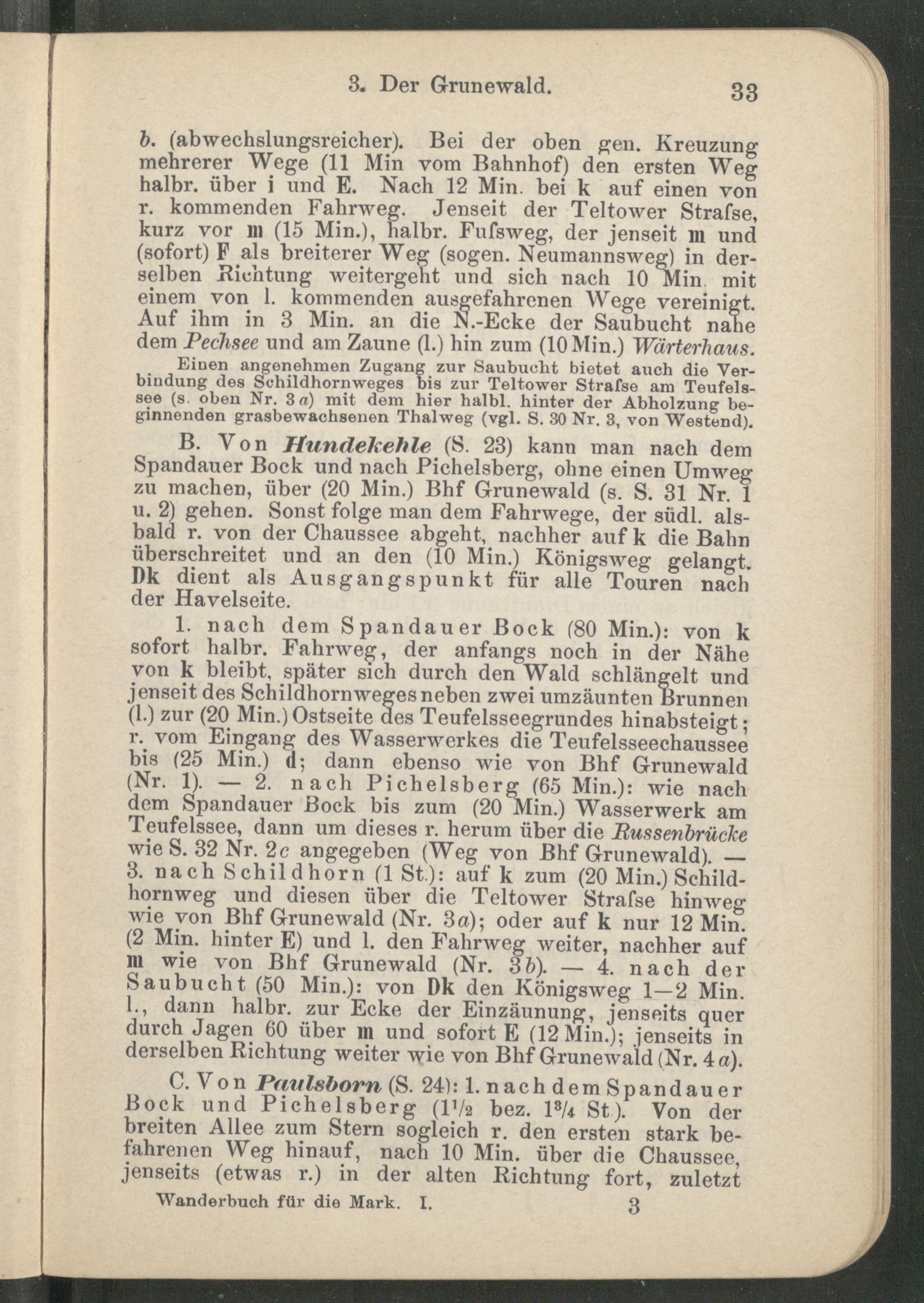 B. Von Hundekehle (8. 23) kann man nach dem Spandauer Bock und nach Pichelsberg, ohne einen Umweg zu machen, über (20 Min.) Bhf Grunewald (s. S. 31 Nr. 1 u. 2) gehen. Sonst folge man dem Fahrwege, der südl. alsbald r. von der Chaussee abgeht, nachher n auf k die Bah überschreitet und an den (10 Min.) Königsweg gelangt. Dk dient als Ausgangspunkt für alle Touren nach der Havelseite.