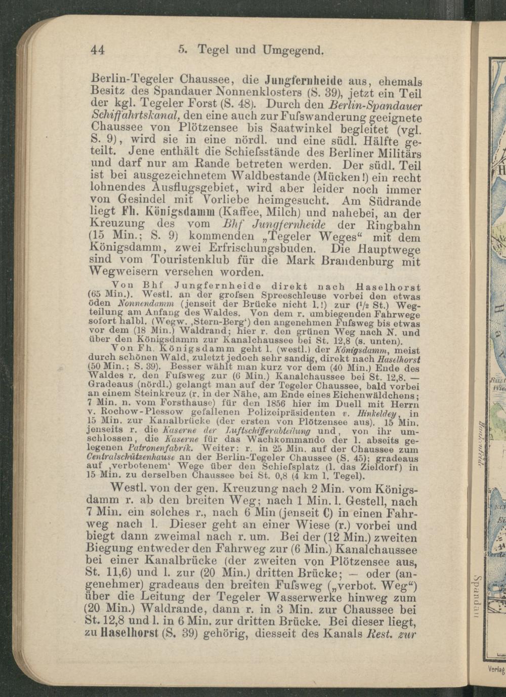 Von Fh. Königsdamm geht 1. (westl.) der Königsdamm, meist durch schönen Wald, zuletzt jedoch sehr sandig, direkt nach Haselhorst (50 Min.; S. 39). Besser wählt man kurz vor dem (40 Min.) Ende des Waldes r. den Fußweg zur (6 Min.) Kanalchaussee bei St. 12,8. — Gradeaus (nördl.) gelangt man auf der Tegeler Chaussee, bald vorbei an einem Steinkreuz (r. in der Nähe, am Ende eines Eichenwäldchens; 7 Min. n. vom Forsthause) für den 1856 hier im Duell mit Herrn v. Rochow-Plessow gefallenen Polizeipräsidenten v. Hinkeldey, in 15 Min. zur Kanalbrücke (der ersten von Plötzensee aus). 15 Min. jenseits r. die Kaserne der Luftschifferabteilung und, von ihr umschlossen , die Kaserne für das Wachkommando der 1. abseits gelegenen Patronenfabrik. Weiter: r. in 25 Min. auf der Chaussee zum Centralschützenhause an der Berlin-Tegeler Chaussee (S. 45); gradeaus auf ,verbotenem' Wege über den Schießplatz (1. das Zieldorf) in 15 Min. zu derselben Chaussee bei St. 0,8 (4 km 1. Tegel).
