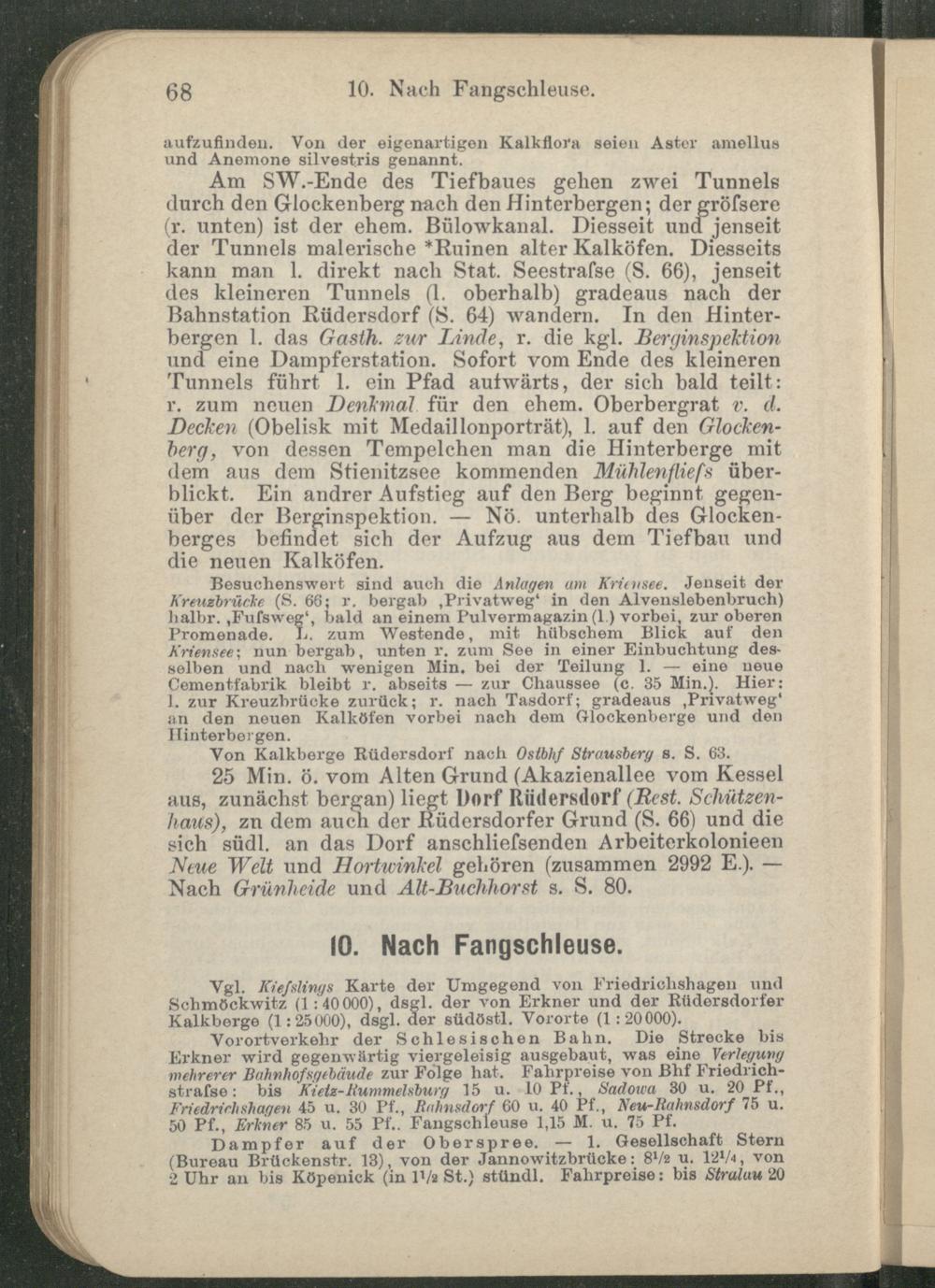 Am SW.-Ende des Tiefbaues gehen zwei Tunnels durch den Glockenberg nach den Hinterbergen; der größere (r. unten) ist der ehem. Bülowkanal. Diesseit una jenseit der Tunnels malerische *Ruinen alter Kalköfen. Diesseits kann man 1. direkt nach Stat. Seestraße (S. 66), jenseit des kleineren Tunnels (1. oberhalb) gradeaus nach der Bahnstation Rüdersdorf (S. 64) wandern. In den Hinterbergen 1. das Gasth. zur Linde, r. die kgl. Berginspektion und eine Dampferstation. Sofort vom Ende des kleineren Tunnels führt 1. ein Pfad aufwärts, der sich bald teilt: r. zum neuen Denkmal für den ehem. Oberbergrat v . d. Decken (Obelisk mit Medaillonporträt), 1. auf den Glockenberg, von dessen Tempelchen man die Hinterberge mit dem aus dem Stienitzsee kommenden Mühlenfließ überblickt. Ein andrer Aufstieg auf den Berg beginnt gegenüber der Berginspektion. — Nö. unterhalb des Glockenberges befindet sich der Aufzug aus dem Tiefbau und die neuen Kalköfen.