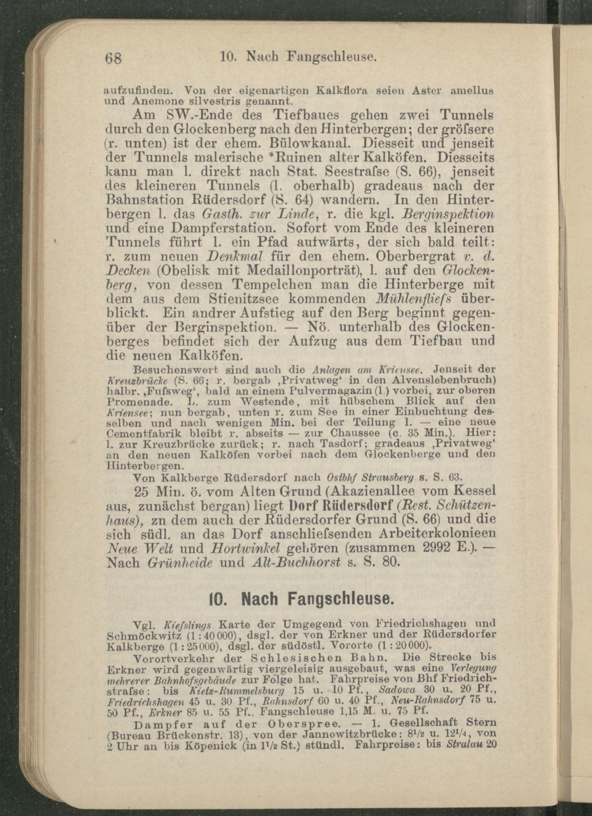 Besuchenswert sind auch die Anlagen am Kriensee. Jenseit der Kreuzbrücke (S. 66; r. bergab ,Privatweg‘ in den Alvenslebenbruch) halbr. ,Fußweg‘, bald an einem Pulvermagazin (1.) vorbei, zur oberen Promenade. 1. zum Westende, mit hübschem Blick auf den Kriensee ; nun bergab, unten r. zum See in einer Einbuchtung desselben und nach wenigen Min, bei der Teilung 1. — eine neue Cementfabrik bleibt r. abseits — zur Chaussee (c. 35 Min.). Hier: 1. zur Kreuzbrücke zurück; r. nach Tasdorf; gradeaus 'Privatweg' an den neuen Kalköfen vorbei nach dem Glockenberge und den Hinterbergen.