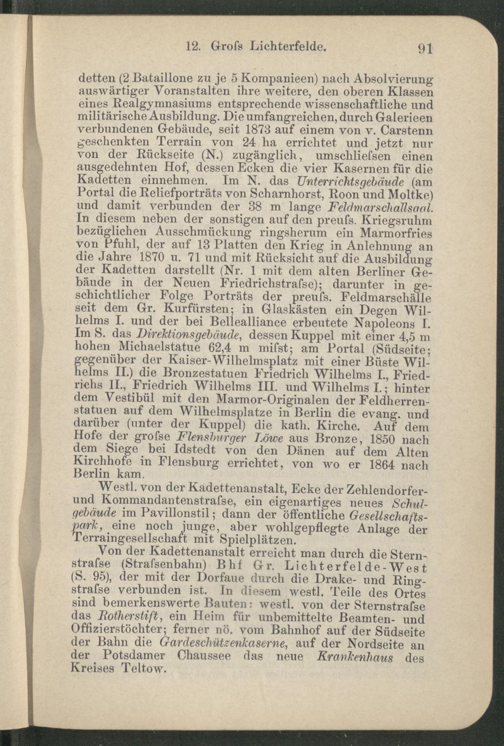 detten (2 Bataillone zu je 5 Kompanieen) nach Absolvierung auswärtiger Voranstalten ihre weitere, den oberen Klassen eines Realgymnasiums entsprechende wissenschaftliche und militärische Ausbildung. Die umfangreichen, durch Galerieen verbundenen Gebäude, seit 1873 auf einem von v. Carstenn geschenkten Terrain von 24 ha errichtet und jetzt nur von der Rückseite (N.) zugänglich, umschließen einen ausgedehnten Hof, dessen Ecken die vier Kasernen für die Kadetten einnehmen. Im N. das Unterrichtsgebäude (am Portal die Reliefporträts von Scharnhorst, Roon und Moltke) und damit verbunden der 38 m lange Feldmarschallsaal. In diesem neben der sonstigen auf den preuß. Kriegsruhm bezüglichen Ausschmückung ringsherum ein Marmorfries von Pfuhl, der auf 13 Platten den Krieg in Anlehnung an die Jahre 1870 u. 71 und mit Rücksicht auf die Ausbildung der Kadetten darstellt (Nr. 1 mit dem alten Berliner Gebäude in der Neuen Friedrichstraße); darunter in geschichtlicher Folge Porträts der preuß. Feldmarschälle seit dem Gr. Kurfürsten; in Glaskästen ein Degen Wilhelms I. und der bei Bellealliance erbeutete Napoleons I. Im S. das Direktionsgebäude , dessen Kuppel mit einer 4,5 m hohen Michaelstatue 62,4 m mißt; am Portal (Südseite; gegenüber der Kaiser-Wilhelmsplatz mit einer Büste Wilhelms II.) die Bronzestatuen Friedrich Wilhelms I., Friedrichs II., Friedrich Wilhelms III. und Wilhelms I.; hinter dem Vestibül mit den Marmor-Originalen der Feldherrenstatuen auf dem Wilhelmsplatze in Berlin die evang. und darüber (unter der Kuppel) die kath. Kirche. Auf dem Hofe der große F lensburger Löwe aus Bronze, 1850 nach dem Siege bei Idstedt von den Dänen auf dem Alten Kirchhofe in Flensburg errichtet, von wo er 1864 nach Berlin kam.