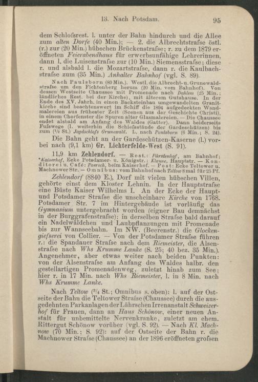 Nach Teltow ( a U St.; Omnibus s. oben): 1. auf der Ostseite der Bahn die Teltower Straße (Chaussee) durch die ausgedehnten Parkanlagen der Lährschen Irrenanstalt Schweizerhof für Frauen, dann an Haus Schönow, einer neuen Anstalt für unbemittelte Nervenkranke, zuletzt am ehem. Rittergut Schönow vorüber (vgl. S. 92). — Nach Kl. Machnow (70 Min.; S. 92): auf der Ostseite der Bahn r. die Machnower Straße (Chaussee) an der 1896 eröffneten großen