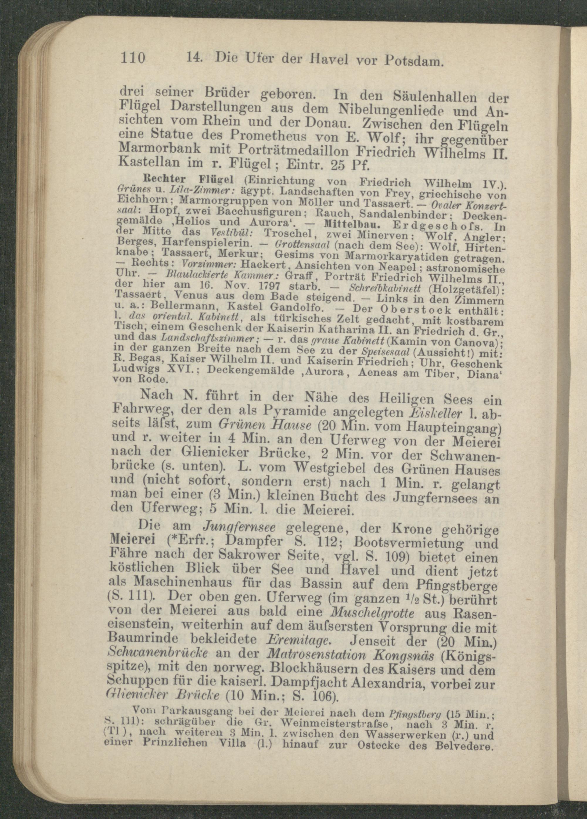 Rechter Flügel (Einrichtung von Friedrich Wilhelm IV.). Grünen u. Lila-Zimmer: ägypt. Landschaften von Frey, griechische von Eichhorn; Marmorgruppen von Möller und Tassaert. — Ovaler Konzert - sa al: Hopf, zwei Bacchusfiguren: Rauch, Sandalenbinder; Deckengemälde ,Helios und Aurora ' . — Mittelbau. Erdgeschoß. ln der Mitte das Vestibül: Troschel, zwei Minerven: Wolf. Angler: Berges, Harfenspielerin. — Grottensaal (nach dem See); Wolf, Hirtenknabe; Tassaert, Merkur; Gesims von Marmorkaryatiden getragen. — Rechts; Vorzimmer: Hackert, Ansichten von Neapel; astronomische Uhr. — Blaulackierte Kammer: Graff, Porträt Friedrich Wilhelms II., der hier am 16. Nov. 1797 starb. — Schreibkabinett (Holzgetäfel): Tassaert, Venus aus dem Bade steigend. — Links in den Zimmern u. a.: Bellermann, Kastei Gandolfo. — Der Oberstock enthält: l. das oriental. Kabinett , als türkisches Zelt gedacht, mit kostbarem Tisch, einem Geschenk der Kaiserin Katharina II. an Friedrich d. Gr., und das Landschaftszimmer: — r. das graue Kabinett (Kamin von Canova); in der ganzen Breite nach dem See zu der Speisesaal (Aussicht!) mit: