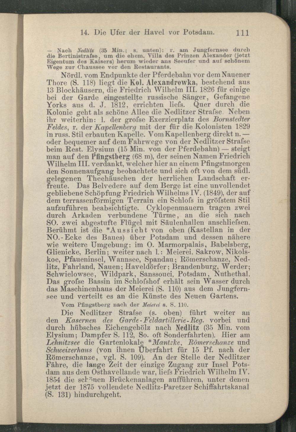Nördl. vom Endpunkte der Pferdebahn vor dem Nauener Thore (S. 118) liegt die Kol. Alexandrowka, bestehend aus 13 Blockhäusern, die Friedrich Wilhelm III. 1826 für einige bei der Garde eingestellte russische Sänger, Gefangene Yorks aus d. J. 1812, errichten ließ. Quer durch die Kolonie geht als schöne Allee die Nedlitzer Straße. Neben ihr weiterhin: 1. der große Exerzierplatz des B ornstedter Feldes, r. der Kapellenberg mit der für die Kolonisten 1829 in russ. Stil erbauten Kapelle. Vom Kapellenberg direkt n. — oder bequemer auf dem Fahrwege von der Nedlitzer Straße beim Rest. Elysium (15 Min. von der Pferdebahn) — steigt man auf den Pfingstberg (68 m), der seinen Namen Friedrich Wilhelm III. verdankt, welcher hier an einem Pfingstmorgen den Sonnenaufgang beobachtete und sich oft von dem südl. gelegenen Theehäuschen der herrlichen Landschaft erfreute. Das Belvedere auf dem Berge ist eine unvollendet gebliebene Schöpfung Friedrich Wilhelms IV. (1849), der auf dem terrassenförmigen Terrain ein Schloß in größtem Stil aufzuführen beabsichtigte. Cyklopenmauern tragen zwei durch Arkaden verbundene Türme, an die sich nach SO. zwei abgestufte Flügel mit Säulenhallen anschließen. Berühmt ist die *Aussicht von oben (Kastellan in der NO.-Ecke des Baues) über Potsdam und dessen nähere wie weitere Umgebung: im O. Marmorpalais, Babelsberg, Glienicke, Berlin; weiter nach 1.: Meierei, Sakrow, Nikols- koe, Pfaueninsel, Wannsee, Spandau; Römerschanze, Nedlitz, Fahrland, Nauen; Haveldörfer; Brandenburg, Werder; Schwielowsee, Wildpark, Sanssouci, Potsdam, Nuthethal. Das große Bassin im Schloßhof erhält sein Wasser durch das Maschinenhaus der Meierei (S. 110) aus dem Jungfernsee und verteilt es an die Künste des Neuen Gartens.