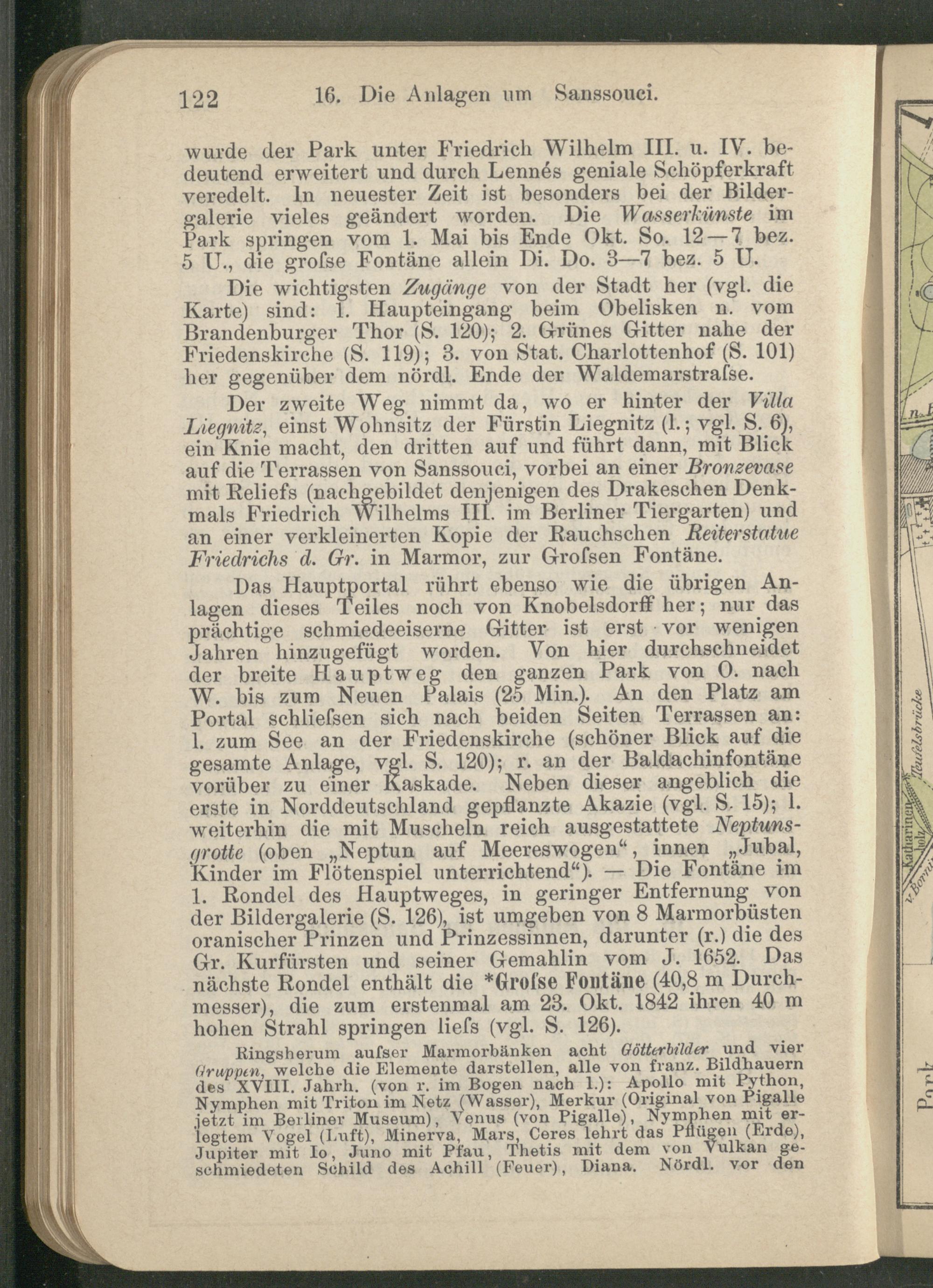 Das Hauptportal rührt ebenso wie die übrigen Anlagen dieses Teiles noch von Knobelsdorff her; nur das prächtige schmiedeeiserne Gitter ist erst vor wenigen Jahren hinzugefügt worden. Von hier durchschneidet der breite Hauptweg den ganzen Park von O. nach W. bis zum Neuen Palais (25 Min.). An den Platz am Portal schließen sich nach beiden Seiten Terrassen an: 1. zum See an der Friedenskirche (schöner Blick auf die gesamte Anlage, vgl. S. 120); r. an der Baldachinfontäne vorüber zu einer Kaskade. Neben dieser angeblich die erste in Norddeutschland gepflanzte Akazie (vgl. S. 15); 1. weiterhin die mit Muscheln reich ausgestattete Neptunsgrotte (oben „Neptun auf Meereswogen“, innen „Jubal, Kinder im Flötenspiel unterrichtend“). — Die Fontäne im 1. Rondel des Hauptweges, in geringer Entfernung von der Bildergalerie (S. 126), ist umgeben von 8 Marmorbüsten oranischer Prinzen und Prinzessinnen, darunter (r.) die des Gr. Kurfürsten und seiner Gemahlin vom J. 1652. Das nächste Rondel enthält die *Große Fontäne (4 0,8 m Durchmesser), die zum erstenmal am 23. Okt. 1842 ihren 40 m hohen Strahl springen ließ (vgl. S. 126).