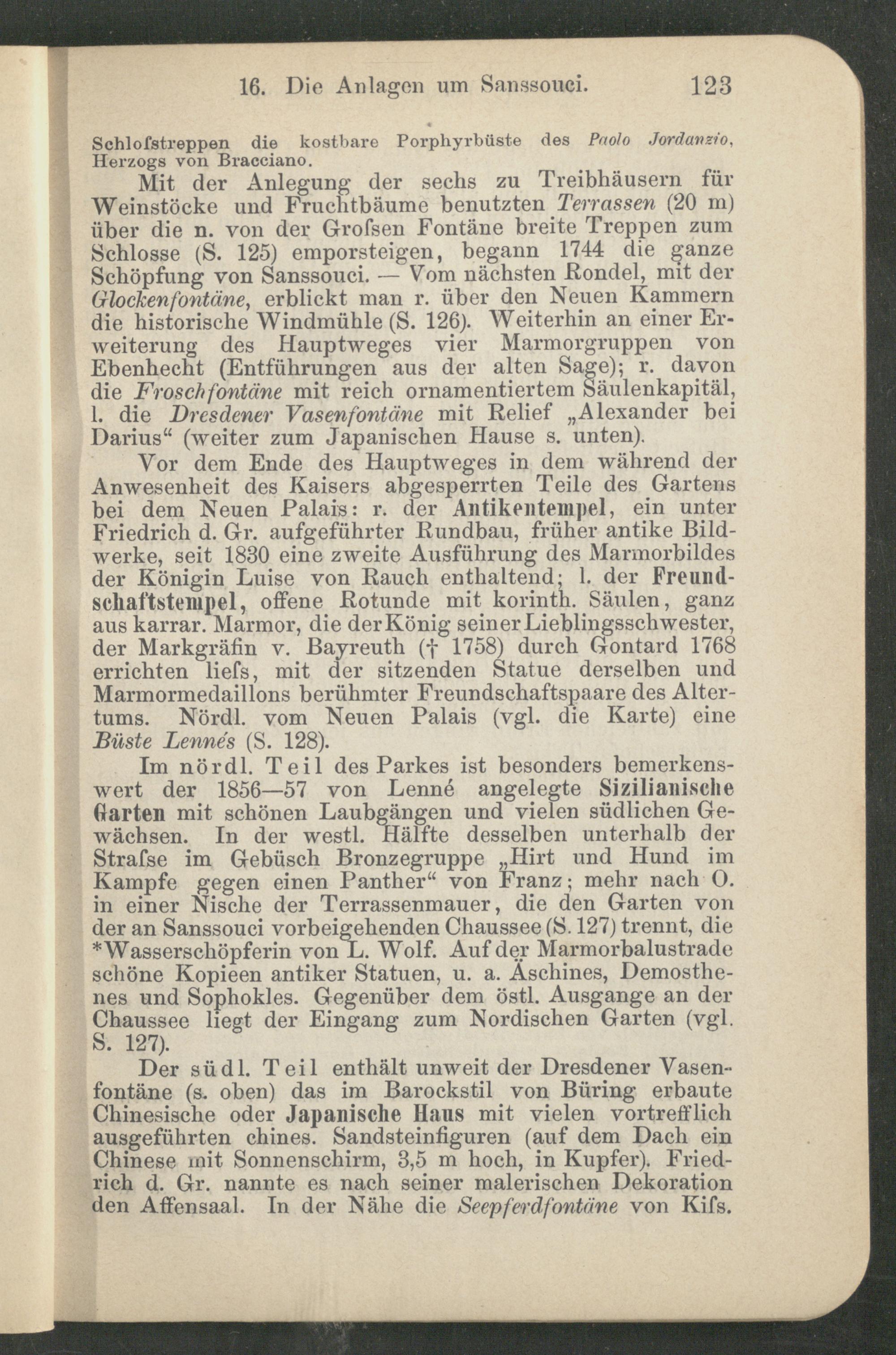 Vor dem Ende des Hauptweges in dem während der Anwesenheit des Kaisers abgesperrten Teile des Gartens bei dem Neuen Palais: r. der Antikentempel, ein unter Friedrich d. Gr. aufgeführter Rundbau, früher antike Bildwerke, seit 1830 eine zweite Ausführung des Marmorbildes der Königin Luise von Rauch enthaltend; 1. der Freund- schaftstempel, offene Rotunde mit korinth. Säulen, ganz aus karrar. Marmor, die der König seiner Lieblingsschwester, der Markgräfin v. Bayreuth (f 1758) durch Gontard 1768 errichten ließ, mit der sitzenden Statue derselben und Marmormedaillons berühmter Freundschaftspaare des Altertums. Nördl. vom Neuen Palais (vgl. die Karte) eine Büste Lennés (S. 128).
