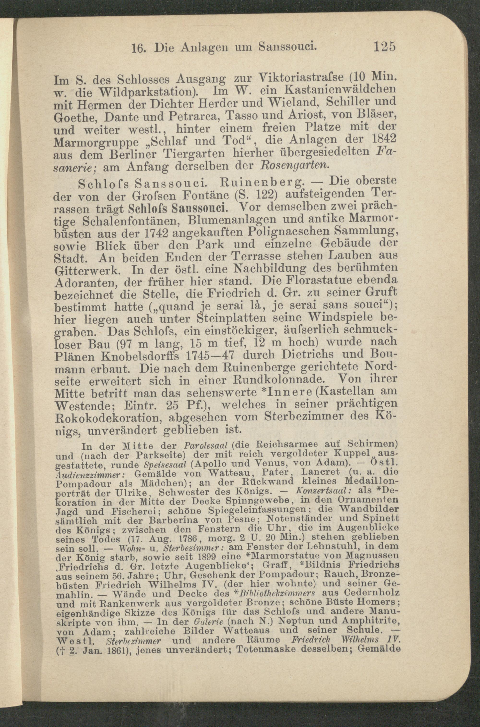 Schloß Sanssouci. Ruinenberg. — Die oberste der von der Großen Fontäne (S. 122) aufsteigenden Terrassen trägt Schloß Sanssouci. Vor demselben zwei prächtige Schalenfontänen, Blumenanlagen und antike Marmorbüsten aus der 1742 angekauften Polignacschen Sammlung, sowie Blick über den Park und einzelne Gebäude der Stadt. An beiden Enden der Terrasse stehen Lauben aus Gitterwerk. In der östl. eine Nachbildung des berühmten Adoranten, der früher hier stand. Die Florastatue ebenda bezeichnet die Stelle, die Friedrich d. Gr. zu seiner Gruft bestimmt hatte („quand je serai là, je serai sans souci“); hier liegen auch unter Steinplatten seine Windspiele begraben. Das Schloß, ein einstöckiger, äußerlich schmuckloser Bau (97 m lang, 15 m tief, 12 m hoch) wurde nach Plänen Knobelsdorffs 1745—47 durch Dietrichs und Bou- mann erbaut. Die nach dem Ruinenberge gerichtete Nordseite erweitert sich in einer Rundkolonnade. Von ihrer Mitte betritt man das sehenswerte *Innere (Kastellan am Westende; Eintr. 25 Pf.), welches in seiner prächtigen Rokokodekoration, abgesehen vom Sterbezimmer des Königs, unverändert geblieben ist.
