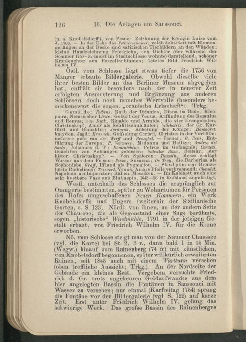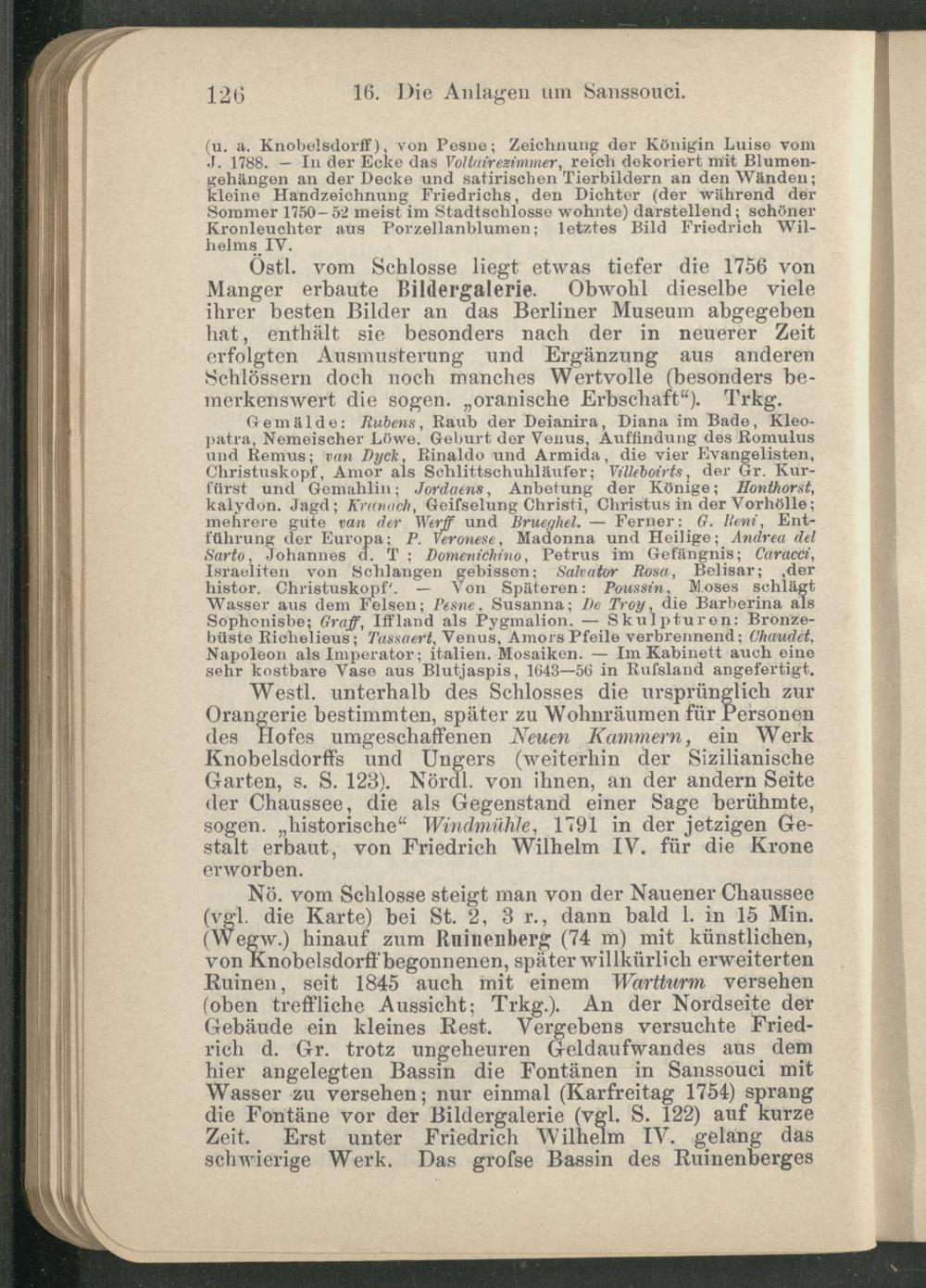 Westl. unterhalb des Schlosses die ursprünglich zur Orangerie bestimmten, später zu Wohnräumen für Personen des Hofes umgeschaffenen Neuen Kammern, ein Werk Knobelsdorffs und Ungers (weiterhin der Sizilianische Garten, s. S. 128). Nördl. von ihnen, an der andern Seite der Chaussee, die als Gegenstand einer Sage berühmte, sogen, „historische“ Windmühle, 1791 in der jetzigen Gestalt erbaut, von Friedrich Wilhelm IV. für die Krone erworben.