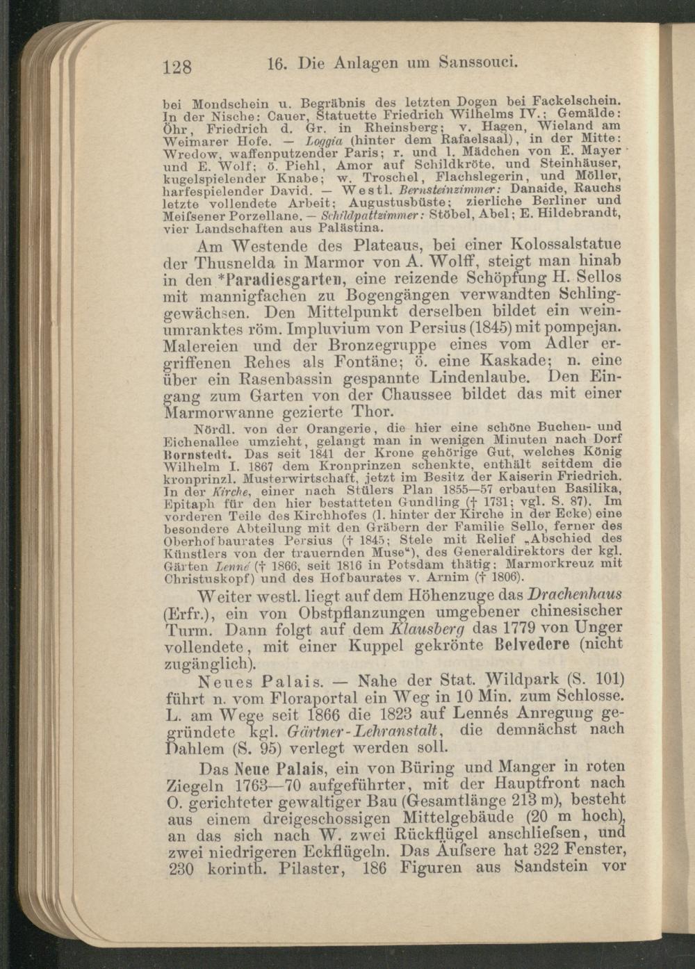 Neues Palais. — Nahe der Stat. Wildpark (S. 101) führt n. vom Floraportal ein Weg in 10 Min. zum Schlosse. L. am Wege seit 1866 die 1823 auf Lennés Anregung gegründete kgl. Gärtner-Lehranstalt, d ie demnächst nach Dahlem (S. 95) verlegt werden soll.