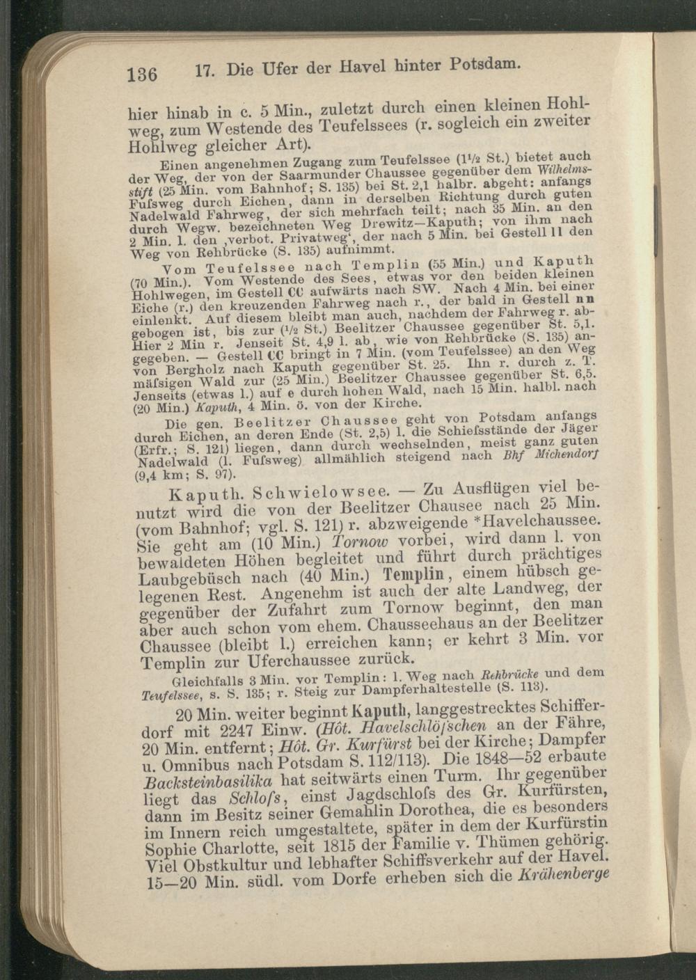 Kaputh. Schwielowsee. — Zu Ausflügen viel benutzt wird die von der Beelitzer Chausee nach 25 Min. (vom Bahnhof; vgl. S. 121) r. abzweigende *Havelchaussee. Sie geht am (10 Min.) Tornow vorbei, wird dann 1. von bewaldeten Höhen begleitet und führt durch prächtiges Laubgebüsch nach (40 Min.) Templin, einem hübsch gelegenen Rest. Angenehm ist auch der alte Landweg, der gegenüber der Zufahrt zum Tornow beginnt, den man aber auch schon vom ehern. Chausseehaus an der Beelitzer Chaussee (bleibt 1.) erreichen kann; er kehrt 3 Min. vor Templin zur Uferchaussee zurück.