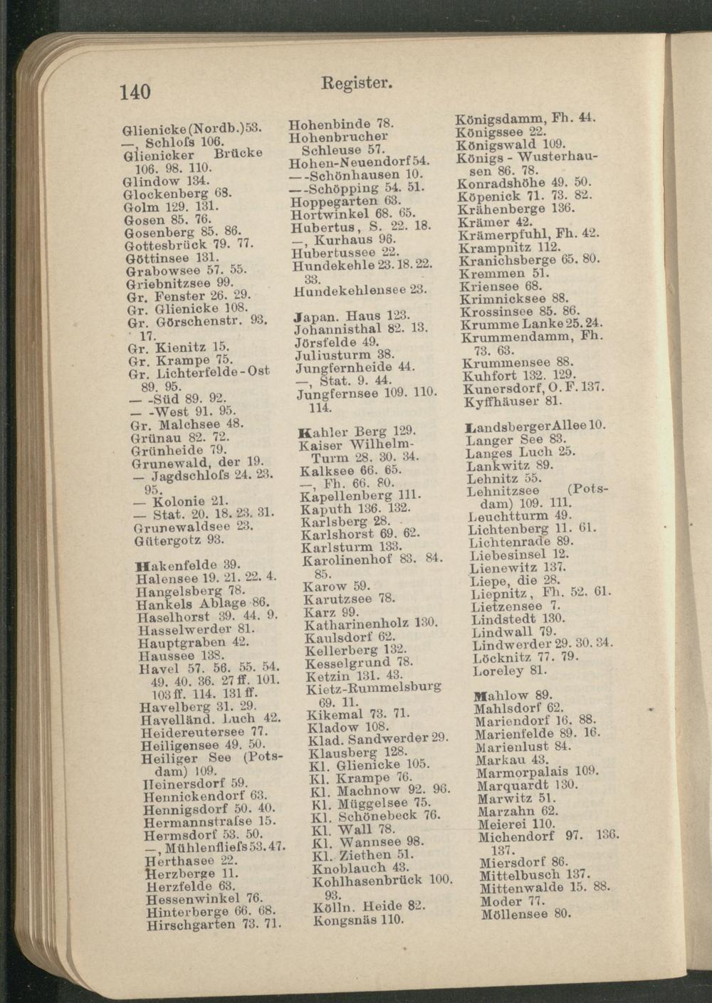 —, Fh. 66. 80. Kapellenberg 111. Kaputh 136. 132. Karlsberg 28. Karlshorst 69. 62. Karlsturm 133. Karolinenhof 83. 84. 85.