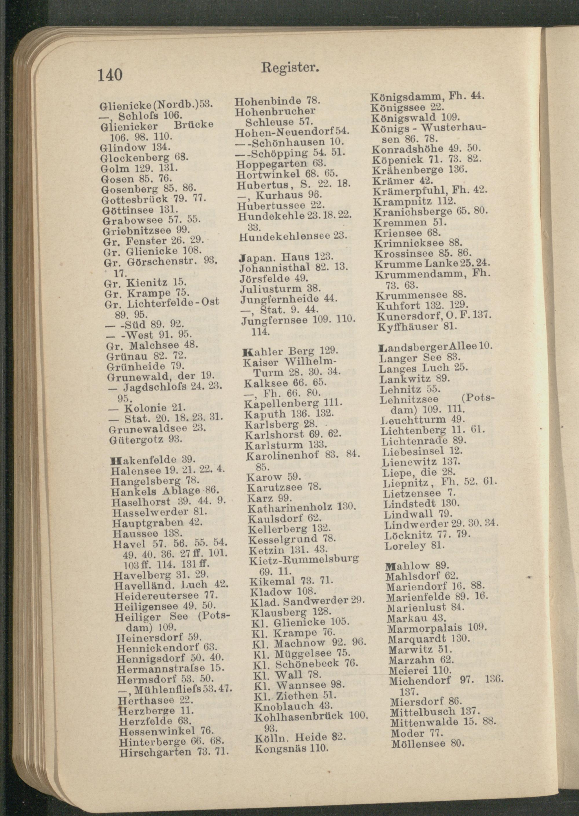 Königsdamm, Fh. 44. Königssee 22. Königswald 109. Königs-Wusterhausen 86. 78. Konradshöhe 49. 50. Köpenick 71. 73. 82. Krähenberge 136. Krämer 42. Krämerpfuhl, Fh. 42. Krampnitz 112. Kranichsberge 65. 80. Kremmen 51. Kriensee 68. Krimnicksee 88. Krossinsee 85. 86. Krumme Lanke 25.24. Krummendamm, Fh. 73. 63.