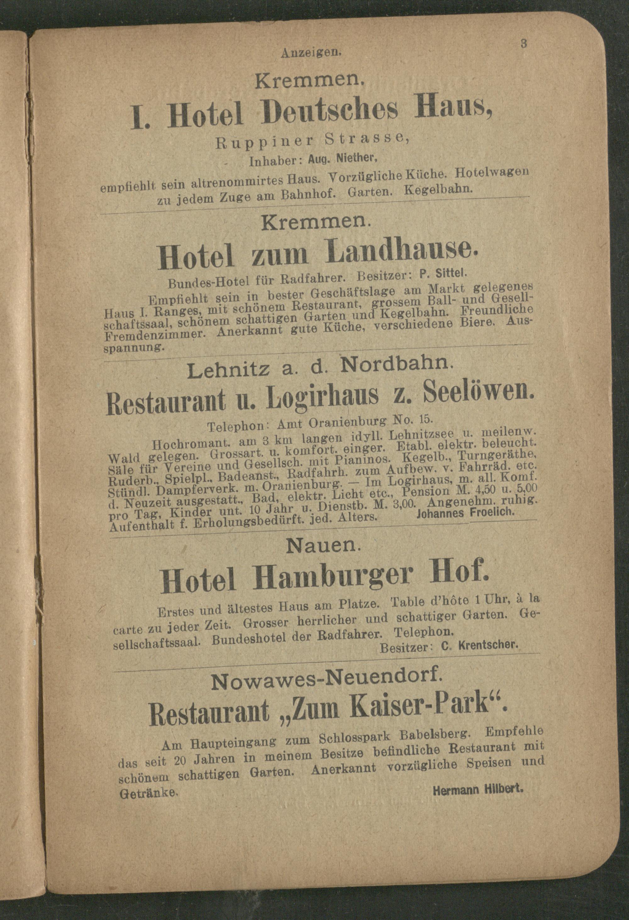 Hochromant. am 3 km langen idyll. Lehnitzsee u. meilenw. Wald gelegen. Grossart. u. komfort. einger. EtabL elektr. beleucht. Säle für Vereine und Geselisch. mit Pianmos. Kegelb., Turngeräthe, Ruderb., Spielpl., Badeanst., Radfahrh. zum Aufbew. v. Fahrrftd. etc. Stündl. Dampferverk. m. Oranienburg. — Im Logirhaus, in. all. Konif. d. Neuzeit ausgestatt., Bad, elektr. Licht etc., Pension M. 4,50 u. 5,00 pro Tag, Kinder unt. 10 Jahr u. Üienstb. M. 3,00. Angenehm, ruhig. Aufenthalt f. Erholungsbedürft, jed. Alters. Johannes Froelich.