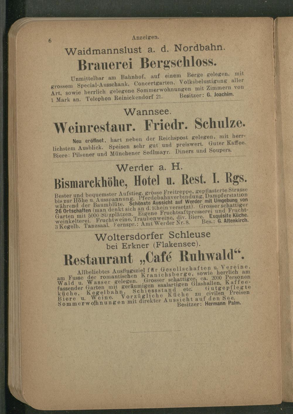 Besterund bequemster Aufstieg, grosse Freitreppe, gepflasterte Strasse bis zur Höhe u. Ausspannung. Pferdebahnverbindung, Dampferstation während der Baumblüte. Schönste Aussicht auf Werder mit Umgebung von 26 Ortschaften (man denkt sich an d. Khein versetzt). Grosser schattiger Garten mit 5000 Sitzplätzen. Eigene Fruchtsaftpresserei und Fruchtweinkelterei. Fruchtweine, Traubenweine, div. Biere. Exquisite Küche. 3Kegelb. Tanzsaal. Fernspr.: Amt "Werder Nr. 8. Bes.: G. Altenkirch.