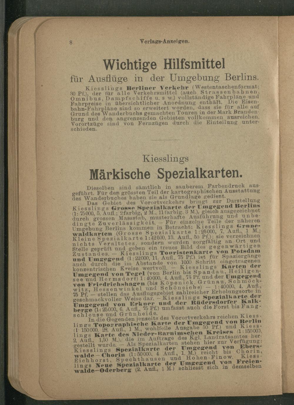 Kiesslings Berliner Verkehr (Westentaschenformat; 30 Pf), der für alle Verkehrsmittel (auch Strassenbahuen, Omnibus, Dampfschiffe u. s w.) vollständige Fahrpläne und Fahrpreise in übersichtlicher Anordnung enthält. Die Eisenbahn-Fahrpläne sind so erweitert worden, dass sie für alle auf Grund des wanderbuchs gemachten Touren in der Mark Brandenburg und den angrenzenden Gebieten vollkommen ausreichen. Vorortzüge sind von Fernzügen durch die Einteilung unterschieden.