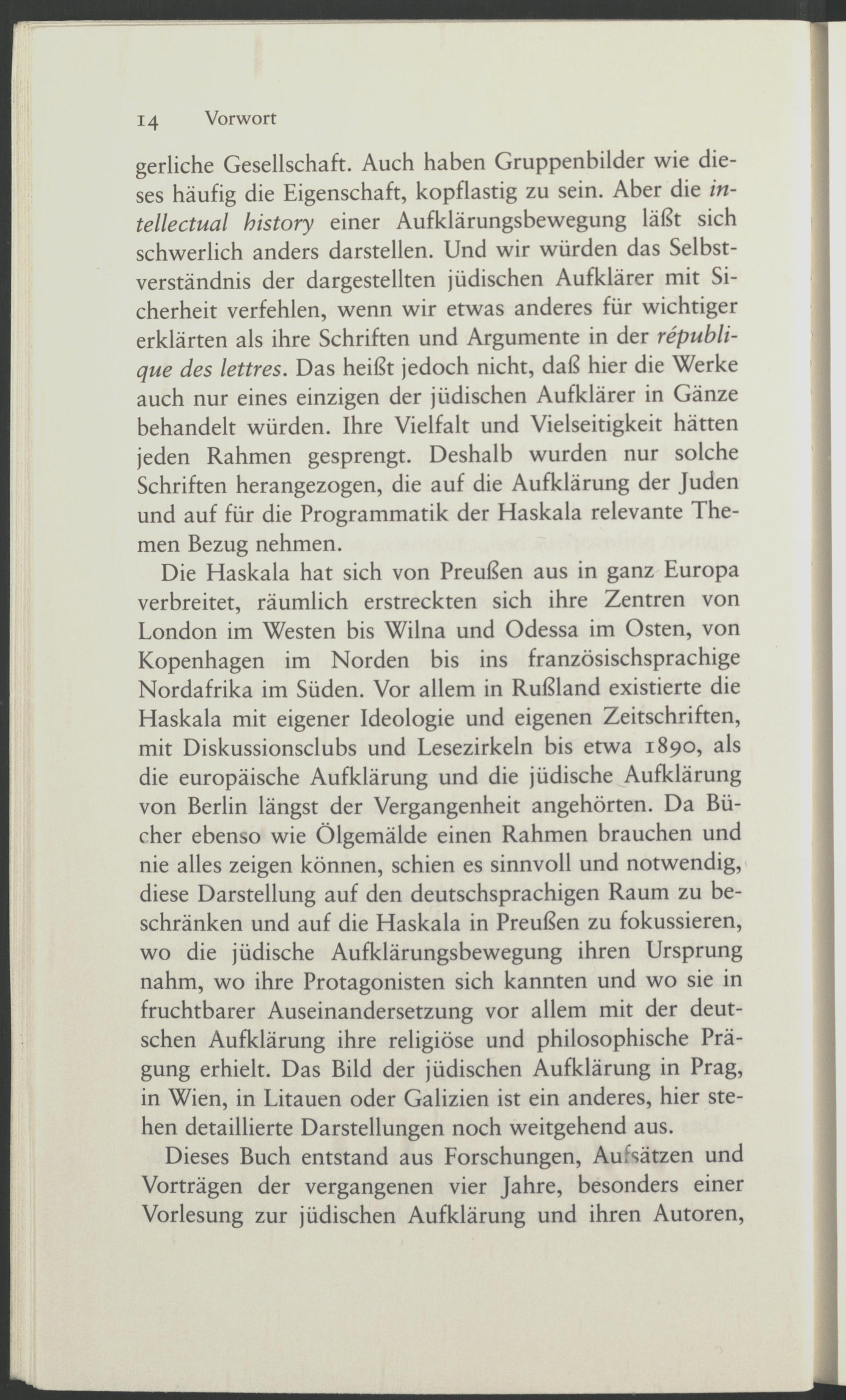 Die Haskala hat sich von Preußen aus in ganz Europa verbreitet, räumlich erstreckten sich ihre Zentren von London im Westen bis Wilna und Odessa im Osten, von Kopenhagen im Norden bis ins französischsprachige Nordafrika im Süden. Vor allem in Rußland existierte die Haskala mit eigener Ideologie und eigenen Zeitschriften, mit Diskussionsclubs und Lesezirkeln bis etwa 1890, als die europäische Aufklärung und die jüdische Aufklärung von Berlin längst der Vergangenheit angehörten. Da Bücher ebenso wie Ölgemälde einen Rahmen brauchen und nie alles zeigen können, schien es sinnvoll und notwendig, diese Darstellung auf den deutschsprachigen Raum zu beschränken und auf die Haskala in Preußen zu fokussieren, wo die jüdische Aufklärungsbewegung ihren Ursprung nahm, wo ihre Protagonisten sich kannten und wo sie in fruchtbarer Auseinandersetzung vor allem mit der deutschen Aufklärung ihre religiöse und philosophische Prägung erhielt. Das Bild der jüdischen Aufklärung in Prag, in Wien, in Litauen oder Galizien ist ein anderes, hier stehen detaillierte Darstellungen noch weitgehend aus.