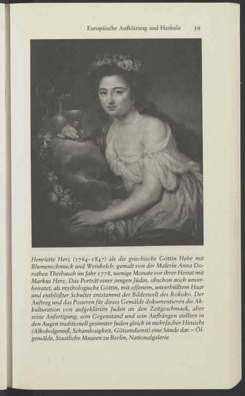 Henriette Herz (1764-1847) als die griechische Göttin Hebe mit Blumenschmuck und Weinkelch, gemalt von der Malerin Anna Dorothea Therbusch im Jahr 1778, wenige Monate vor ihrer Heirat mit Markus Herz. Das Porträt einer jungen Jüdin, obschon noch unverheiratet, als mythologische Göttin, mit offenem, unverhülltem Haar und entblößter Schulter entstammt der Bilderwelt des Rokoko. Der Auftrag und das Posieren für dieses Gemälde dokumentieren die Ak- kulturation von aufgeklärten Juden an den Zeitgeschmack, aber seine Anfertigung, sein Gegenstand und sein Aufhängen stellten in den Augen traditionell gesinnter Juden gleich in mehrfacher Hinsicht (Alkoholgenuß, Schamlosigkeit, Götzendienst) eine Sünde dar. - Ölgemälde, Staatliche Museen zu Berlin, Nationalgalerie