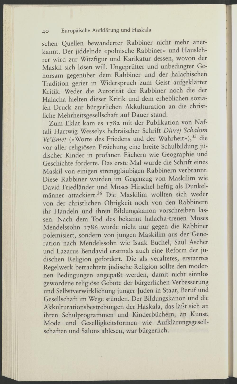 Zum Eklat kam es 1782 mit der Publikation von Naf- tali Hartwig Wesselys hebräischer Schrift Divrej Schalom Ve’Emet («Worte des Friedens und der Wahrheit»), 35 die vor aller religiösen Erziehung eine breite Schulbildung jüdischer Kinder in profanen Fächern wie Geographie und Geschichte forderte. Das erste Mal wurde die Schrift eines Maskil von einigen strenggläubigen Rabbinern verbrannt. Diese Rabbiner wurden im Gegenzug von Maskilim wie David Friedländer und Moses Hirschei heftig als Dunkelmänner attackiert. 36 Die Maskilim wollten sich weder von der christlichen Obrigkeit noch von den Rabbinern ihr Handeln und ihren Bildungskanon vorschreiben lassen. Nach dem Tod des bekannt halacha-treuen Moses Mendelssohn 1786 wurde nicht nur gegen die Rabbiner polemisiert, sondern von jungen Maskilim aus der Generation nach Mendelssohn wie Isaak Euchel, Saul Ascher und Lazarus Bendavid erstmals auch eine Reform der jüdischen Religion gefordert. Die als veraltetes, erstarrtes Regelwerk betrachtete jüdische Religion sollte den modernen Bedingungen angepaßt werden, damit nicht sinnlos gewordene religiöse Gebote der bürgerlichen Verbesserung und Selbstverwirklichung junger Juden in Staat, Beruf und Gesellschaft im Wege stünden. Der Bildungskanon und die Akkulturationsbestrebungen der Haskala, das läßt sich an ihren Schulprogrammen und Kinderbüchern, an Kunst, Mode und Geselligkeitsformen wie Aufklärungsgesellschaften und Salons ablesen, war bürgerlich.