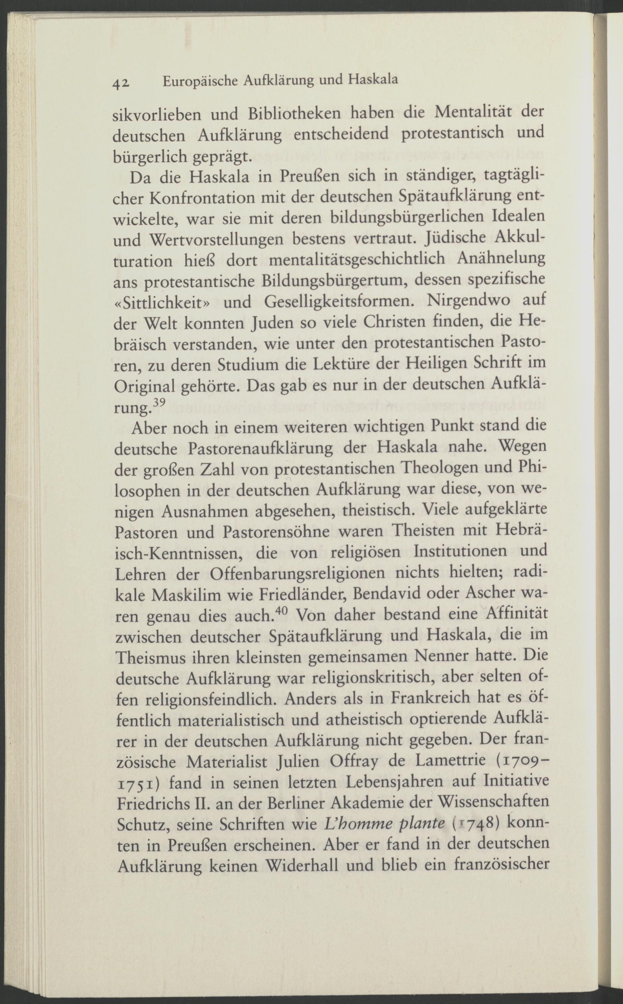 Aber noch in einem weiteren wichtigen Punkt stand die deutsche Pastorenaufklärung der Haskala nahe. Wegen der großen Zahl von protestantischen Theologen und Philosophen in der deutschen Aufklärung war diese, von wenigen Ausnahmen abgesehen, theistisch. Viele aufgeklärte Pastoren und Pastorensöhne waren Theisten mit Hebrä- isch-Kenntnissen, die von religiösen Institutionen und Lehren der Offenbarungsreligionen nichts hielten; radikale Maskilim wie Friedländer, Bendavid oder Ascher waren genau dies auch. 40 Von daher bestand eine Affinität zwischen deutscher Spätaufklärung und Haskala, die im Theismus ihren kleinsten gemeinsamen Nenner hatte. Die deutsche Aufklärung war religionskritisch, aber selten offen religionsfeindlich. Anders als in Frankreich hat es öffentlich materialistisch und atheistisch optierende Aufklärer in der deutschen Aufklärung nicht gegeben. Der französische Materialist Julien Offray de Lamettrie (1709- 1751) fand in seinen letzten Lebensjahren auf Initiative Friedrichs II. an der Berliner Akademie der Wissenschaften Schutz, seine Schriften wie L’homme plante (r 74 8) konnten in Preußen erscheinen. Aber er fand in der deutschen Aufklärung keinen Widerhall und blieb ein französischer