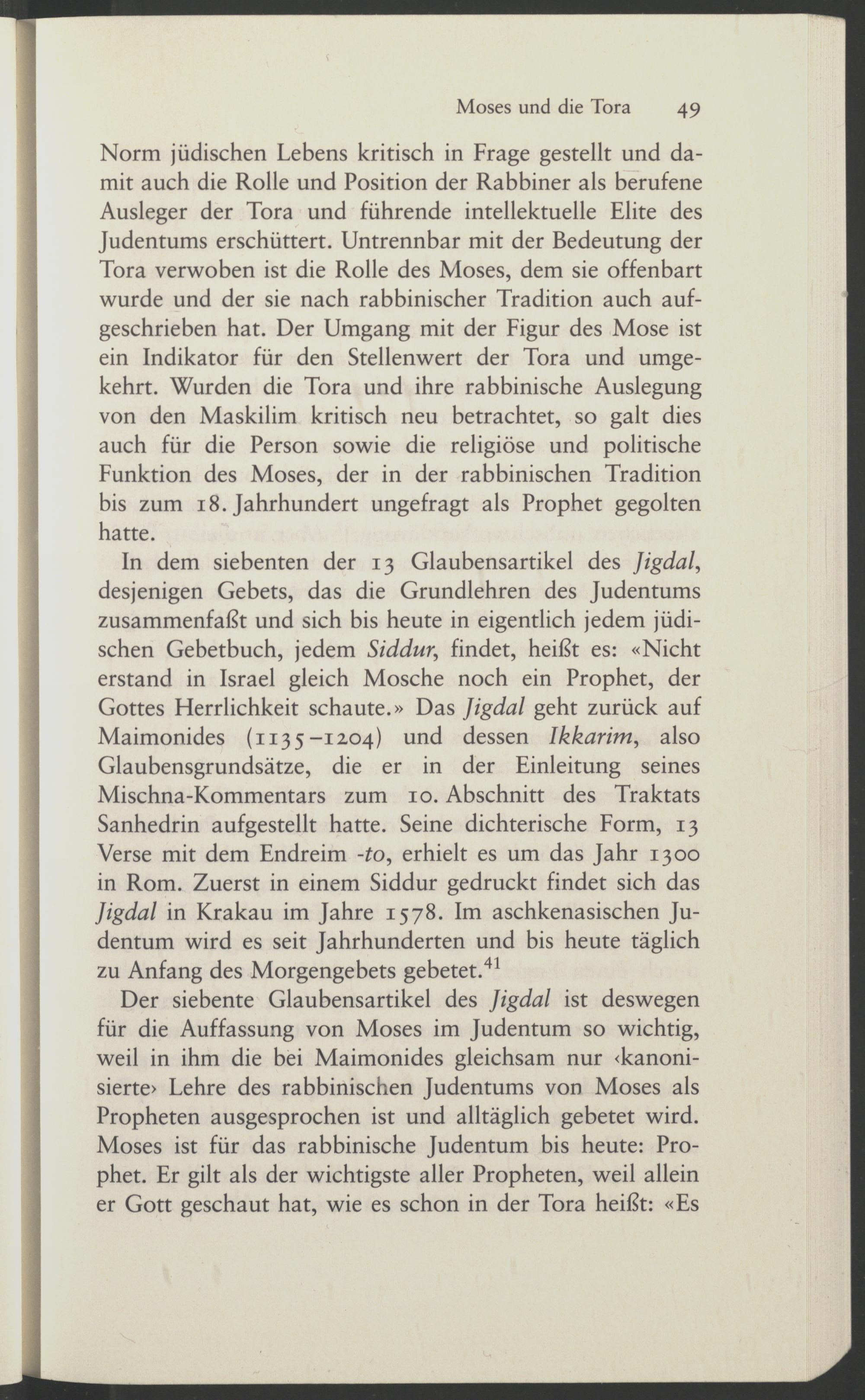 Der siebente Glaubensartikel des Jigdal ist deswegen für die Auffassung von Moses im Judentum so wichtig, weil in ihm die bei Maimonides gleichsam nur <kanoni- sierte> Lehre des rabbinischen Judentums von Moses als Propheten ausgesprochen ist und alltäglich gebetet wird. Moses ist für das rabbinische Judentum bis heute: Prophet. Er gilt als der wichtigste aller Propheten, weil allein er Gott geschaut hat, wie es schon in der Tora heißt: «Es