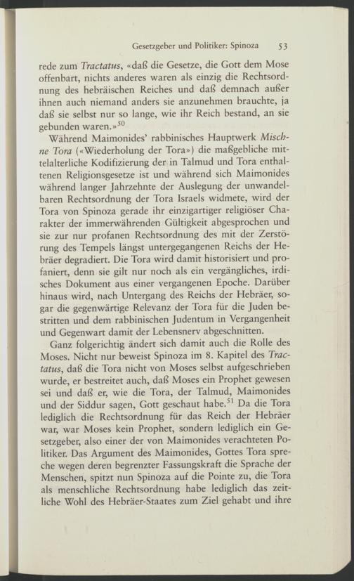 Während Maimonides’ rabbinisches Hauptwerk Miscb- ne Tora («Wiederholung der Tora») die maßgebliche mittelalterliche Kodifizierung der in Talmud und Tora enthaltenen Religionsgesetze ist und während sich Maimonides während langer Jahrzehnte der Auslegung der unwandelbaren Rechtsordnung der Tora Israels widmete, wird der Tora von Spinoza gerade ihr einzigartiger religiöser Charakter der immerwährenden Gültigkeit abgesprochen und sie zur nur profanen Rechtsordnung des mit der Zerstörung des Tempels längst untergegangenen Reichs der Hebräer degradiert. Die Tora wird damit historisiert und profaniert, denn sie gilt nur noch als ein vergängliches, irdisches Dokument aus einer vergangenen Epoche. Darüber hinaus wird, nach Untergang des Reichs der Hebräer, sogar die gegenwärtige Relevanz der Tora für die Juden bestritten und dem rabbinischen Judentum in Vergangenheit und Gegenwart damit der Lebensnerv abgeschnitten.