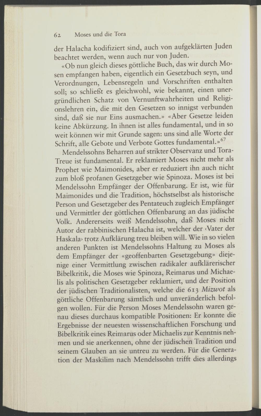 Mendelssohns Beharren auf strikter Observanz und Tora- Treue ist fundamental. Er reklamiert Moses nicht mehr als Prophet wie Maimonides, aber er reduziert ihn auch nicht zum bloß profanen Gesetzgeber wie Spinoza. Moses ist bei Mendelssohn Empfänger der Offenbarung. Er ist, wie für Maimonides und die Tradition, höchstselbst als historische Person und Gesetzgeber des Pentateuch zugleich Empfänger und Vermittler der göttlichen Offenbarung an das jüdische Volk. Andererseits weiß Mendelssohn, daß Moses nicht Autor der rabbinischen Halacha ist, welcher der Water der Haskala> trotz Aufklärung treu bleiben will. Wie in so vielen anderen Punkten ist Mendelssohns Haltung zu Moses als dem Empfänger der «geoffenbarten Gesetzgebung» diejenige einer Vermittlung zwischen radikaler aufklärerischer Bibelkritik, die Moses wie Spinoza, Reimarus und Michaelis als politischen Gesetzgeber reklamiert, und der Position der jüdischen Traditionalisten, welche die 613 Mizwot als göttliche Offenbarung sämtlich und unveränderlich befolgen wollen. Für die Person Moses Mendelssohn waren genau dieses durchaus kompatible Positionen: Er konnte die Ergebnisse der neuesten wissenschaftlichen Forschung und Bibelkritik eines Reimarus oder Michaelis zur Kenntnis nehmen und sie anerkennen, ohne der jüdischen Tradition und seinem Glauben an sie untreu zu werden. Für die Generation der Maskilim nach Mendelssohn trifft dies allerdings