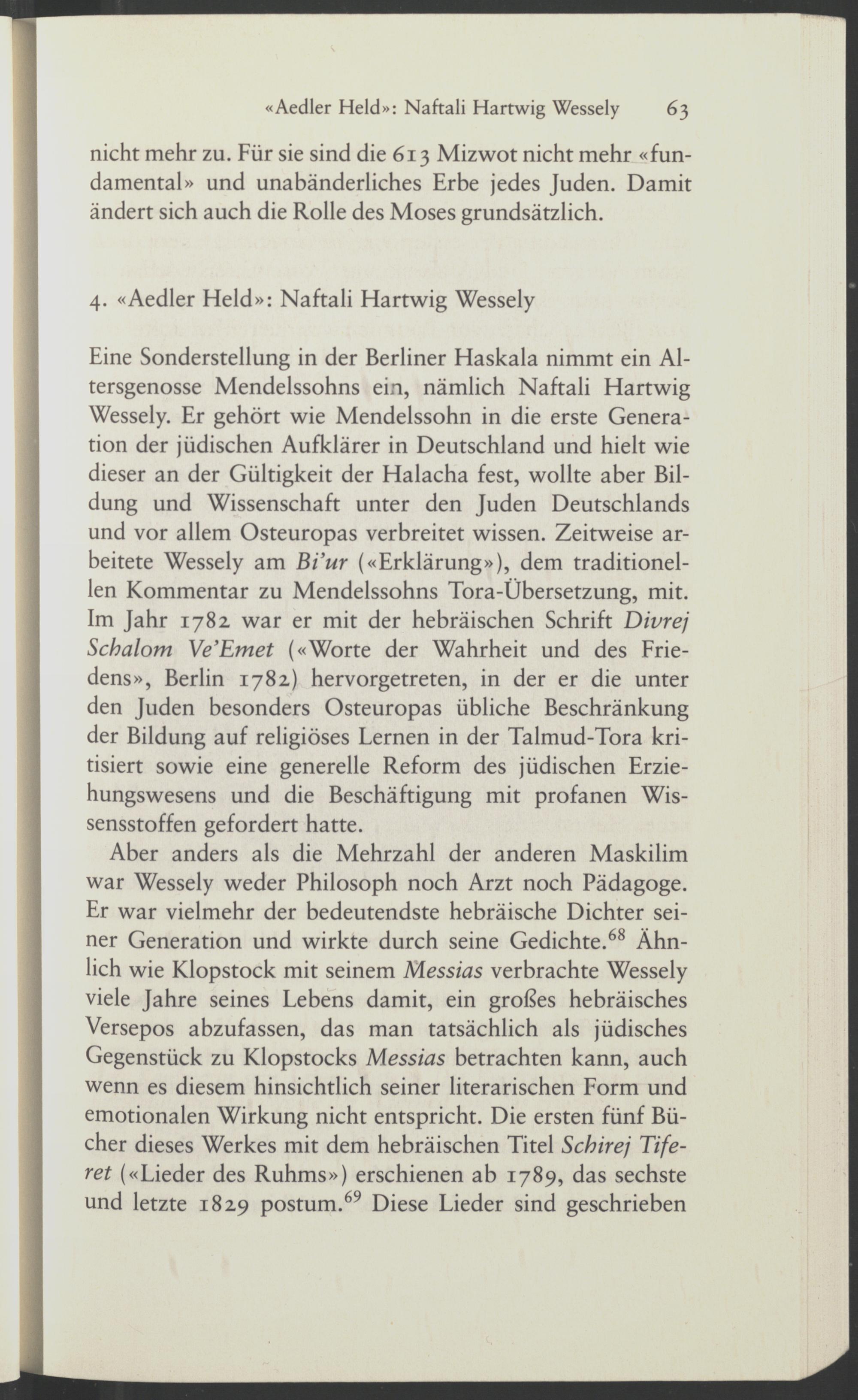 Aber anders als die Mehrzahl der anderen Maskilim war Wessely weder Philosoph noch Arzt noch Pädagoge. Er war vielmehr der bedeutendste hebräische Dichter seiner Generation und wirkte durch seine Gedichte. 68 Ähnlich wie Klopstock mit seinem Messias verbrachte Wessely viele Jahre seines Lebens damit, ein großes hebräisches Versepos abzufassen, das man tatsächlich als jüdisches Gegenstück zu Klopstocks Messias betrachten kann, auch wenn es diesem hinsichtlich seiner literarischen Form und emotionalen Wirkung nicht entspricht. Die ersten fünf Bücher dieses Werkes mit dem hebräischen Titel Schirej Tife- ret («Lieder des Ruhms») erschienen ab 1789, das sechste und letzte 1829 postum. 69 Diese Lieder sind geschrieben