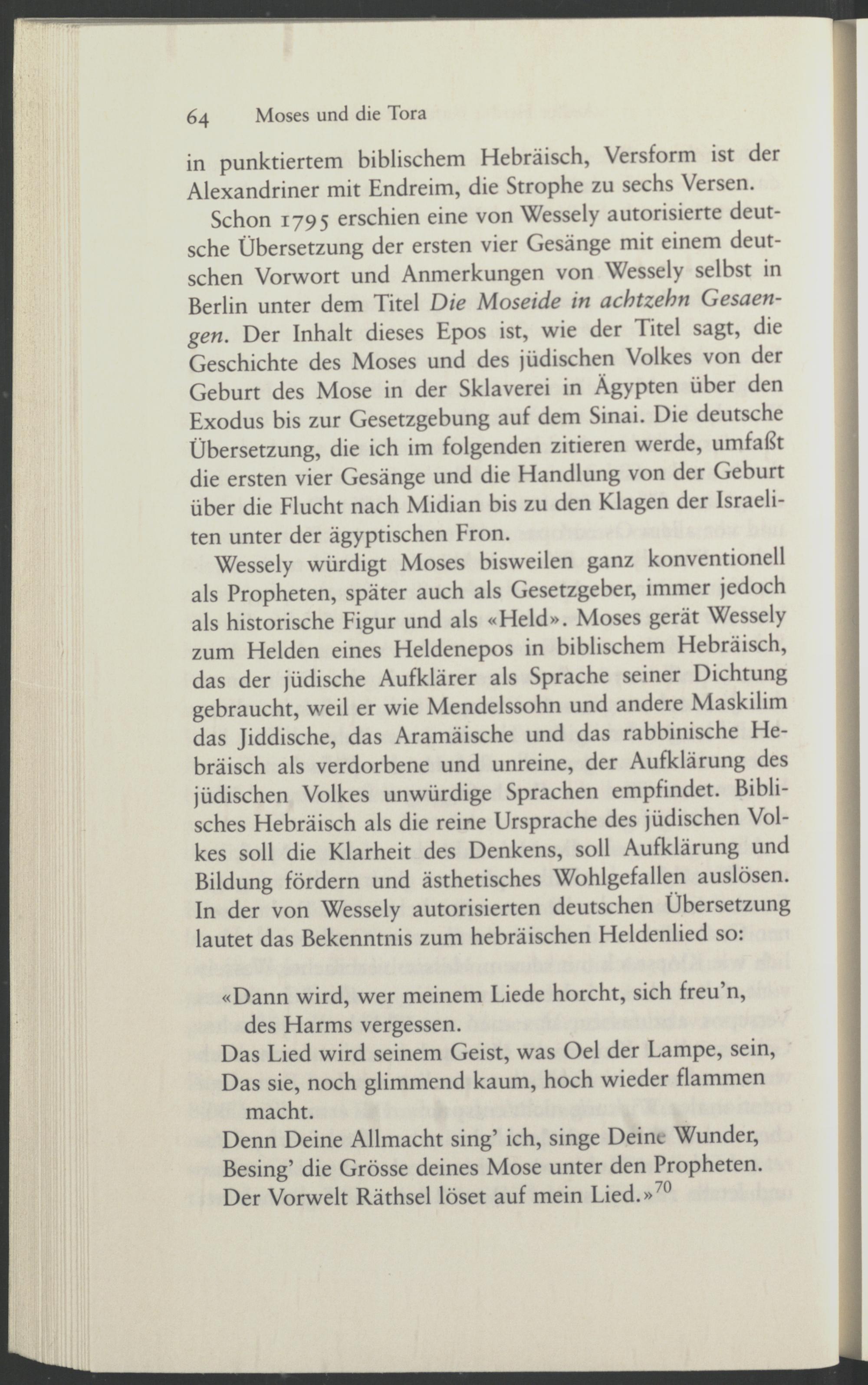 Schon 1795 erschien eine von Wessely autorisierte deutsche Übersetzung der ersten vier Gesänge mit einem deutschen Vorwort und Anmerkungen von Wessely selbst in Berlin unter dem Titel Die Moseide in achtzehn Gesaen- gen. Der Inhalt dieses Epos ist, wie der Titel sagt, die Geschichte des Moses und des jüdischen Volkes von der Geburt des Mose in der Sklaverei in Ägypten über den Exodus bis zur Gesetzgebung auf dem Sinai. Die deutsche Übersetzung, die ich im folgenden zitieren werde, umfaßt die ersten vier Gesänge und die Handlung von der Geburt über die Flucht nach Midian bis zu den Klagen der Israeliten unter der ägyptischen Fron.