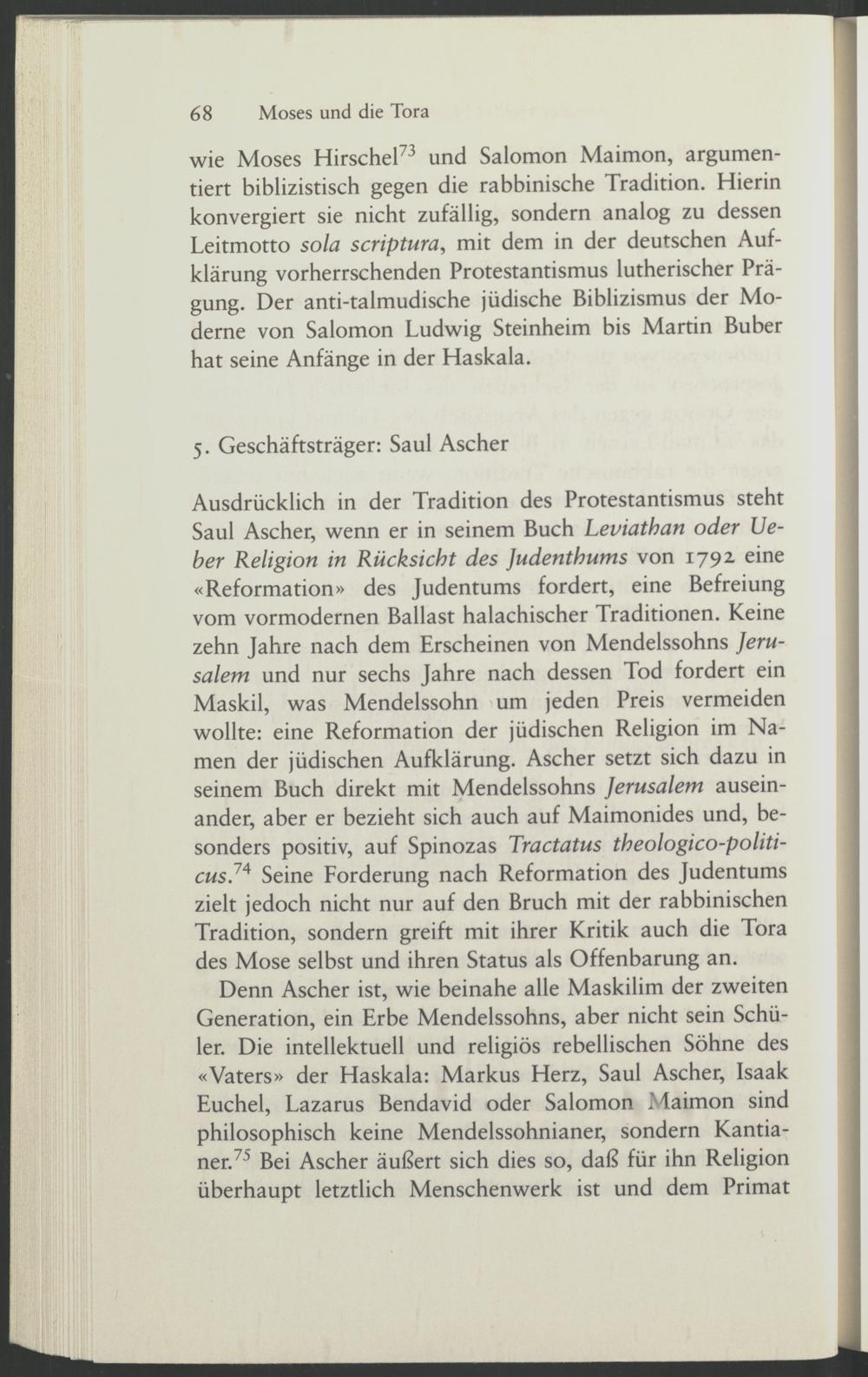 Ausdrücklich in der Tradition des Protestantismus steht Saul Ascher, wenn er in seinem Buch Leviathan oder Lieber Religion in Rücksicht des Judenthums von 1792 eine «Reformation» des Judentums fordert, eine Befreiung vom vormodernen Ballast halachischer Traditionen. Keine zehn Jahre nach dem Erscheinen von Mendelssohns Jerusalem und nur sechs Jahre nach dessen Tod fordert ein Maskil, was Mendelssohn um jeden Preis vermeiden wollte: eine Reformation der jüdischen Religion im Namen der jüdischen Aufklärung. Ascher setzt sich dazu in seinem Buch direkt mit Mendelssohns Jerusalem auseinander, aber er bezieht sich auch auf Maimonides und, besonders positiv, auf Spinozas Tractatus theologico-politi- cus . 74 Seine Forderung nach Reformation des Judentums zielt jedoch nicht nur auf den Bruch mit der rabbinischen Tradition, sondern greift mit ihrer Kritik auch die Tora des Mose selbst und ihren Status als Offenbarung an.