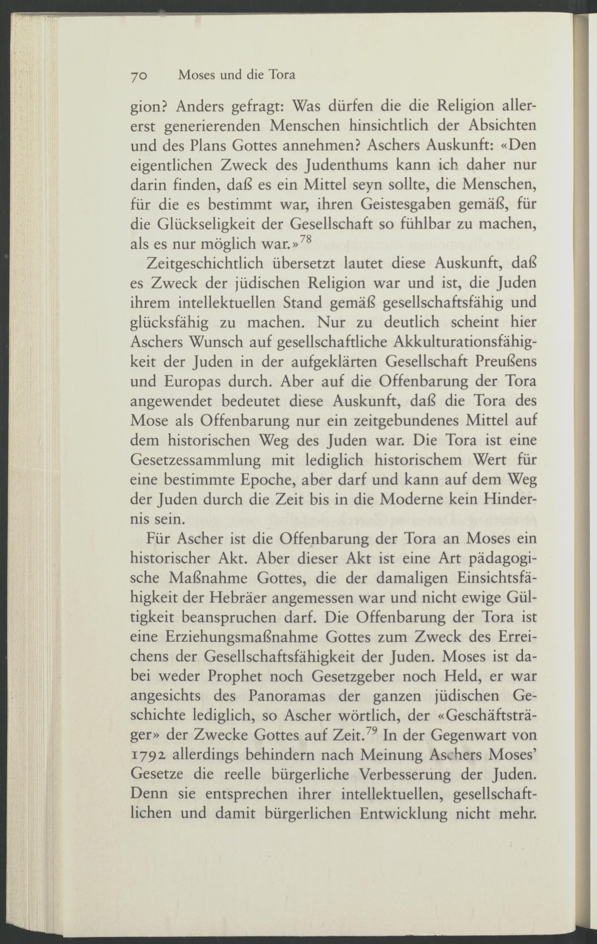 Für Ascher ist die Offenbarung der Tora an Moses ein historischer Akt. Aber dieser Akt ist eine Art pädagogische Maßnahme Gottes, die der damaligen Einsichtsfähigkeit der Hebräer angemessen war und nicht ewige Gültigkeit beanspruchen darf. Die Offenbarung der Tora ist eine Erziehungsmaßnahme Gottes zum Zweck des Errei- chens der Gesellschaftsfähigkeit der Juden. Moses ist dabei weder Prophet noch Gesetzgeber noch Held, er war angesichts des Panoramas der ganzen jüdischen Geschichte lediglich, so Ascher wörtlich, der «Geschäftsträger» der Zwecke Gottes auf Zeit. 79 In der Gegenwart von 1792 allerdings behindern nach Meinung Aschers Moses’ Gesetze die reelle bürgerliche Verbesserung der Juden. Denn sie entsprechen ihrer intellektuellen, gesellschaftlichen und damit bürgerlichen Entwicklung nicht mehr.