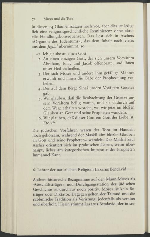 in diesen 14 Glaubenssätzen noch vor, aber dies ist lediglich eine religionsgeschichtliche Reminiszenz ohne aktuelle Handlungskonsequenzen. Das liest sich in Aschers «Organon des Judentums», das dem Inhalt nach vieles aus dem Jigdal übernimmt, so: