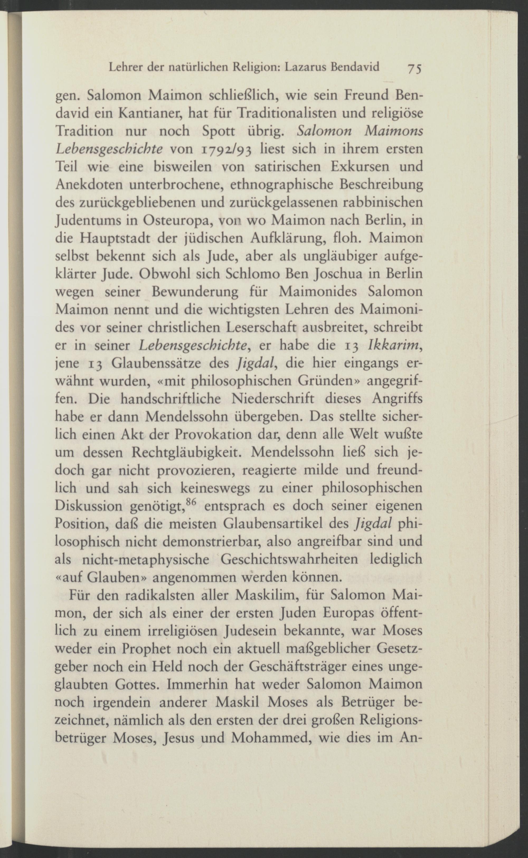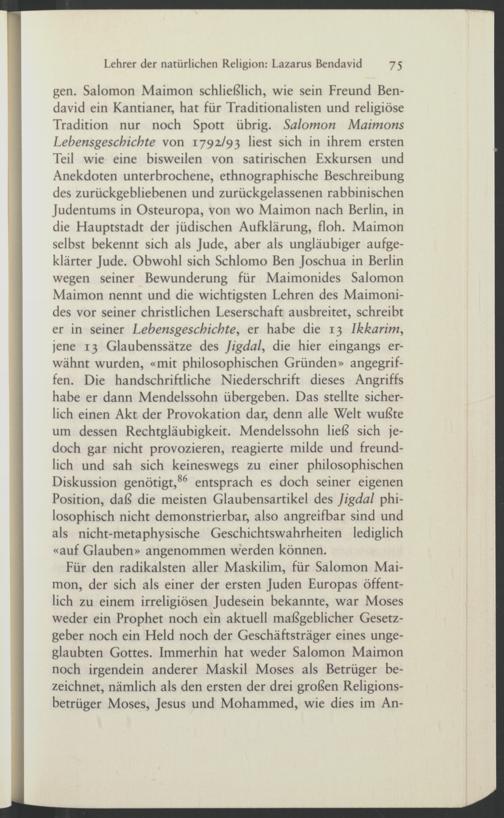 gen. Salomon Maimon schließlich, wie sein Freund Bendavid ein Kantianer, hat für Traditionalisten und religiöse Tradition nur noch Spott übrig. Salomon Maimons Lebensgeschichte von 1792/93 liest sich in ihrem ersten Teil wie eine bisweilen von satirischen Exkursen und Anekdoten unterbrochene, ethnographische Beschreibung des zurückgebliebenen und zurückgelassenen rabbinischen Judentums in Osteuropa, von wo Maimon nach Berlin, in die Hauptstadt der jüdischen Aufklärung, floh. Maimon selbst bekennt sich als Jude, aber als ungläubiger aufgeklärter Jude. Obwohl sich Schlomo Ben Joschua in Berlin wegen seiner Bewunderung für Maimonides Salomon Maimon nennt und die wichtigsten Lehren des Maimonides vor seiner christlichen Leserschaft ausbreitet, schreibt er in seiner Lebensgeschichte, er habe die 13 Ikkarim, jene 13 Glaubenssätze des Jigdal, die hier eingangs erwähnt wurden, «mit philosophischen Gründen» angegriffen. Die handschriftliche Niederschrift dieses Angriffs habe er dann Mendelssohn übergeben. Das stellte sicherlich einen Akt der Provokation dar, denn alle Welt wußte um dessen Rechtgläubigkeit. Mendelssohn ließ sich jedoch gar nicht provozieren, reagierte milde und freundlich und sah sich keineswegs zu einer philosophischen Diskussion genötigt, 86 entsprach es doch seiner eigenen Position, daß die meisten Glaubensartikel des Jigdal philosophisch nicht demonstrierbar, also angreifbar sind und als nicht-metaphysische Geschichtswahrheiten lediglich «auf Glauben» angenommen werden können.