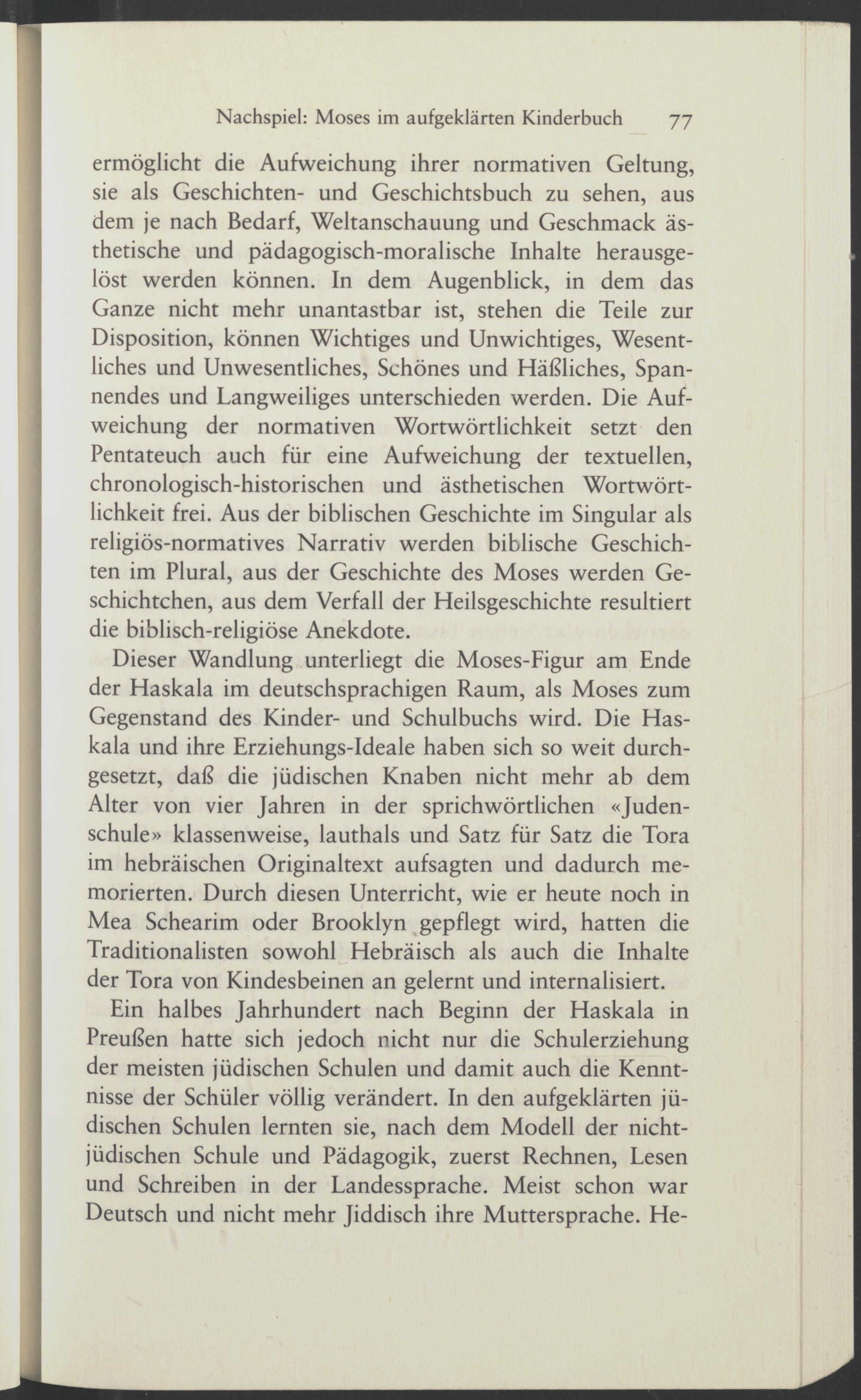 Dieser Wandlung unterliegt die Moses-Figur am Ende der Haskala im deutschsprachigen Raum, als Moses zum Gegenstand des Kinder- und Schulbuchs wird. Die Haskala und ihre Erziehungs-Ideale haben sich so weit durchgesetzt, daß die jüdischen Knaben nicht mehr ab dem Alter von vier Jahren in der sprichwörtlichen «Judenschule» klassenweise, lauthals und Satz für Satz die Tora im hebräischen Originaltext aufsagten und dadurch memorierten. Durch diesen Unterricht, wie er heute noch in Mea Schearim oder Brooklyn gepflegt wird, hatten die Traditionalisten sowohl Hebräisch als auch die Inhalte der Tora von Kindesbeinen an gelernt und internalisiert.
