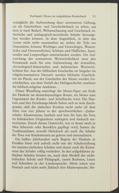 ermöglicht die Aufweichung ihrer normativen Geltung, sie als Geschichten- und Geschichtsbuch zu sehen, aus dem je nach Bedarf, Weltanschauung und Geschmack ästhetische und pädagogisch-moralische Inhalte herausgelöst werden können. In dem Augenblick, in dem das Ganze nicht mehr unantastbar ist, stehen die Teile zur Disposition, können Wichtiges und Unwichtiges, Wesentliches und Unwesentliches, Schönes und Häßliches, Spannendes und Langweiliges unterschieden werden. Die Aufweichung der normativen Wortwörtlichkeit setzt den Pentateuch auch für eine Aufweichung der textuellen, chronologisch-historischen und ästhetischen Wortwörtlichkeit frei. Aus der biblischen Geschichte im Singular als religiös-normatives Narrativ werden biblische Geschichten im Plural, aus der Geschichte des Moses werden Ge- schichtchen, aus dem Verfall der Heilsgeschichte resultiert die biblisch-religiöse Anekdote.
