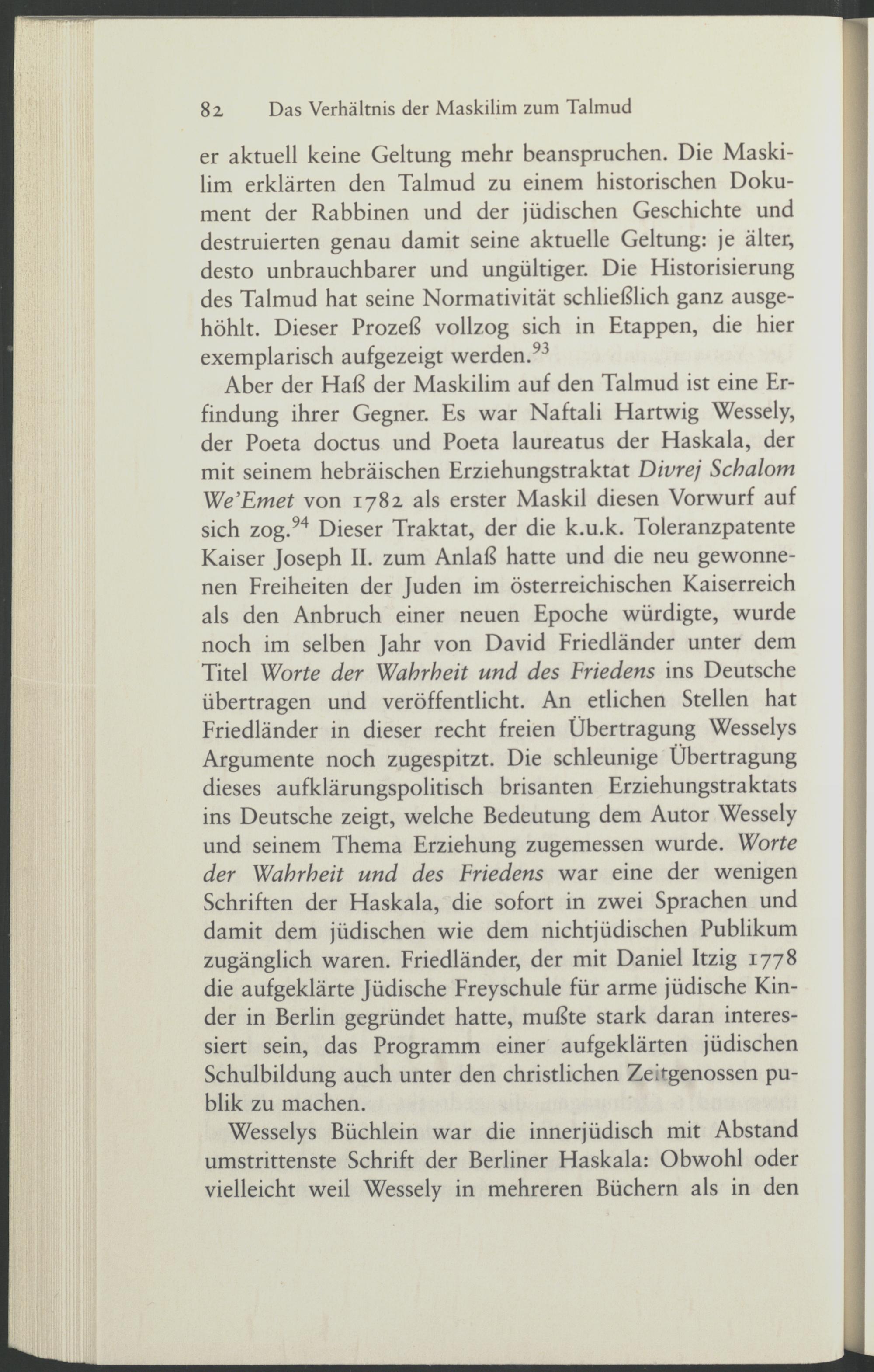 Aber der Haß der Maskilim auf den Talmud ist eine Erfindung ihrer Gegner. Es war Naftali Hartwig Wessely, der Poeta doctus und Poeta laureatus der Haskala, der mit seinem hebräischen Erziehungstraktat Divrej Schalom We’Emet von 1782 als erster Maskil diesen Vorwurf auf sich zog. 94 Dieser Traktat, der die k.u.k. Toleranzpatente Kaiser Joseph II. zum Anlaß hatte und die neu gewonnenen Freiheiten der Juden im österreichischen Kaiserreich als den Anbruch einer neuen Epoche würdigte, wurde noch im selben Jahr von David Friedländer unter dem Titel Worte der Wahrheit und des Friedens ins Deutsche übertragen und veröffentlicht. An etlichen Stellen hat Friedländer in dieser recht freien Übertragung Wesselys Argumente noch zugespitzt. Die schleunige Übertragung dieses aufklärungspolitisch brisanten Erziehungstraktats ins Deutsche zeigt, welche Bedeutung dem Autor Wessely und seinem Thema Erziehung zugemessen wurde. Worte der Wahrheit und des Friedens war eine der wenigen Schriften der Haskala, die sofort in zwei Sprachen und damit dem jüdischen wie dem nicht jüdischen Publikum zugänglich waren. Friedländer, der mit Daniel Itzig 1778 die aufgeklärte Jüdische Frey schule für arme jüdische Kinder in Berlin gegründet hatte, mußte stark daran interessiert sein, das Programm einer aufgeklärten jüdischen Schulbildung auch unter den christlichen Zeitgenossen publik zu machen.