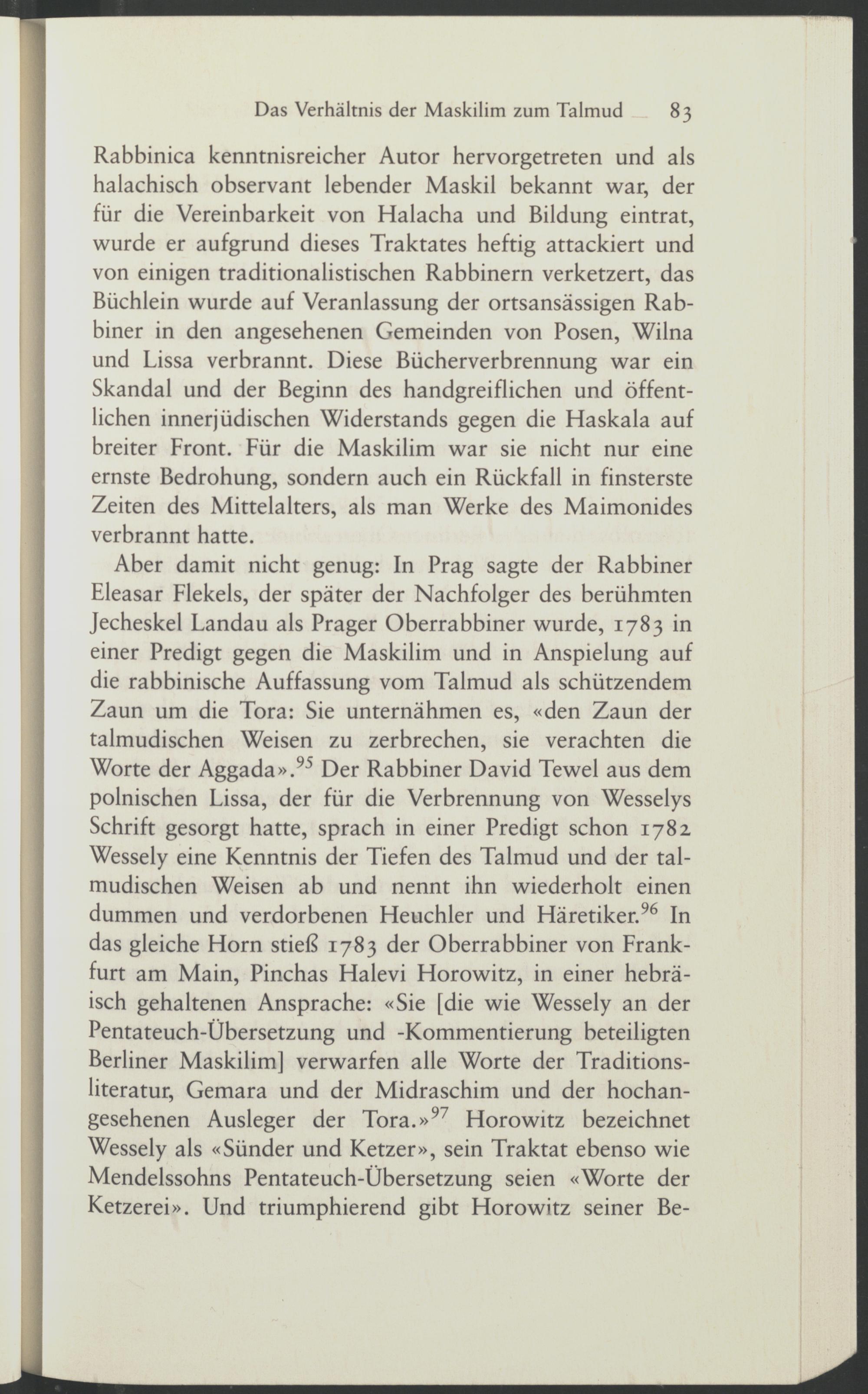 Aber damit nicht genug: In Prag sagte der Rabbiner Eleasar Flekels, der später der Nachfolger des berühmten Jecheskel Landau als Prager Oberrabbiner wurde, 1783 in einer Predigt gegen die Maskilim und in Anspielung auf die rabbinische Auffassung vom Talmud als schützendem Zaun um die Tora: Sie unternähmen es, «den Zaun der talmudischen Weisen zu zerbrechen, sie verachten die Worte der Aggada». 95 Der Rabbiner David Tewel aus dem polnischen Lissa, der für die Verbrennung von Wesselys Schrift gesorgt hatte, sprach in einer Predigt schon 1782 Wessely eine Kenntnis der Tiefen des Talmud und der talmudischen Weisen ab und nennt ihn wiederholt einen dummen und verdorbenen Heuchler und Häretiker. 96 In das gleiche Horn stieß 1783 der Oberrabbiner von Frankfurt am Main, Pinchas Halevi Horowitz, in einer hebräisch gehaltenen Ansprache: «Sie [die wie Wessely an der Pentateuch-Übersetzung und -Kommentierung beteiligten Berliner Maskilim] verwarfen alle Worte der Traditionsliteratur, Gemara und der Midraschim und der hochangesehenen Ausleger der Tora.» 97 Horowitz bezeichnet Wessely als «Sünder und Ketzer», sein Traktat ebenso wie Mendelssohns Pentateuch-Übersetzung seien «Worte der Ketzerei». Und triumphierend gibt Horowitz seiner Be-