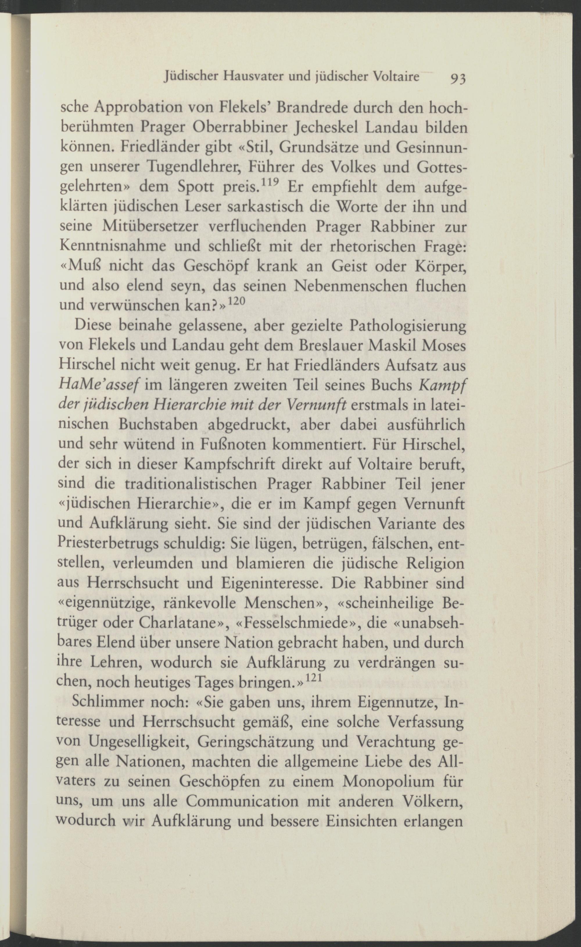 Diese beinahe gelassene, aber gezielte Pathologisierung von Flekels und Landau geht dem Breslauer Maskil Moses Hirschei nicht weit genug. Er hat Friedländers Aufsatz aus HaMe’assef im längeren zweiten Teil seines Buchs Kampf der jüdischen Hierarchie mit der Vernunft erstmals in lateinischen Buchstaben abgedruckt, aber dabei ausführlich und sehr wütend in Fußnoten kommentiert. Für Hirschei, der sich in dieser Kampfschrift direkt auf Voltaire beruft, sind die traditionalistischen Prager Rabbiner Teil jener «jüdischen Hierarchie», die er im Kampf gegen Vernunft und Aufklärung sieht. Sie sind der jüdischen Variante des Priesterbetrugs schuldig: Sie lügen, betrügen, fälschen, entstellen, verleumden und blamieren die jüdische Religion aus Herrschsucht und Eigeninteresse. Die Rabbiner sind «eigennützige, ränkevolle Menschen», «scheinheilige Betrüger oder Charlatane», «Fesselschmiede», die «unabsehbares Elend über unsere Nation gebracht haben, und durch ihre Lehren, wodurch sie Aufklärung zu verdrängen suchen, noch heutiges Tages bringen .» 121